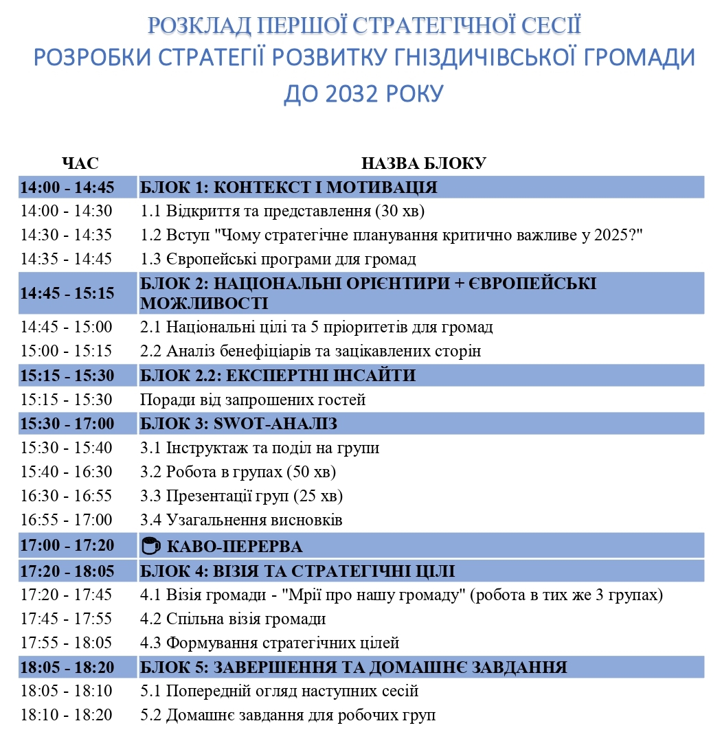 📣📣📣 Шановні мешканці громади! Запрошуємо вас на першу Стратегічну сесію, яка відбудеться завтра, 12 серпня, о 14:00 у приміщенні школи в Гніздичеві. Це перший важливий крок у розробці 📑Стратегії розвитку нашої громади на період 2026-2032 років.