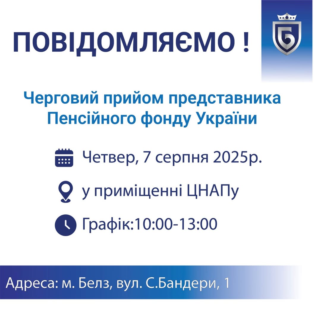 Шановні мешканці громади! Кожного першого четверга місяця у приміщенні ЦНАПу в м. Белз відбувається прийом представника Пенсійного фонду України.