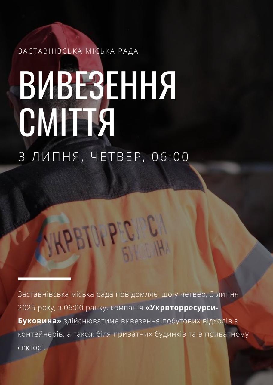 Шановні мешканці Заставни та навколишніх територій!Заставнівська міська рада знову звертається до вас з важливим оголошенням, що стосується підтримки чистоти та комфорту у нашій громаді. Ефективне вивезення сміття у Заставні є ключовим елементом якісного життя, гігієни та екологічної безпеки. Ми прагнемо забезпечити найкращі умови для кожного жителя, і тому регулярний та організований збір побутових відходів залишається одним із пріоритетів у комунальному господарстві. Це стосується не лише естетики, але й здоров’я всіх мешканців.З радістю повідомляємо, що компанія «Укрвторресурси-Буковина», наш надійний партнер у питаннях санітарії, продовжує планові роботи з вивезення побутових відходів. Наступне планове вивезення сміття Заставна відбудеться у четвер, 3 липня 2025 року, починаючи з 06:00 ранку. Ця ініціатива охопить як контейнерні майданчики, так і приватний сектор, а також території біля приватних будинків. Метою є забезпечення максимального покриття та зручності для всіх верств населення, адже систематичний збір сміття є запорукою порядку.Для того щоб процес збору сміття пройшов максимально швидко та ефективно, Заставнівська міська рада просить усіх мешканців проявити відповідальність та завчасно підготувати свої відходи. Дуже важливо виставити сміття у спеціально відведених для цього місцях або біля своїх домівок вже у середу ввечері, 2 липня. Завчасна підготовка дозволить працівникам «Укрвторресурси-Буковина» безперешкодно та своєчасно виконати свою роботу, уникнувши затримок і незручностей. Пам’ятайте, що своєчасне вивезення побутових відходів запобігає накопиченню сміття, поширенню неприємних запахів та створює більш привабливий вигляд нашого міста. Це ваш внесок у чистоту громади.Ми високо цінуємо ваше співробітництво та розуміння важливості цього питання. Завдяки спільним зусиллям ми зможемо підтримувати нашу Заставну у зразковому стані. Хочемо відзначити, що аналогічні роботи з вивезення сміття успішно проводились вже цього тижня, у понеділок. Ваша активна участь та відповідальне ставлення до чистоти громади є для нас найкращою подякою. Кожен внесок, навіть найменший, у справу підтримки екологічного благополуччя є надзвичайно цінним. Ми сподіваємось на продовження такої плідної співпраці.Підтримка чистоти на вулицях Заставни — це спільна справа. Ми віримо, що лише разом, працюючи як єдина громада, ми зможемо забезпечити чистоту, порядок та добробут для всіх. Дотримання графіку вивезення побутових відходів та правил їх утилізації є запорукою здоров’я наших родин та краси нашого міста. Просимо уважно поставитися до цього оголошення та сприяти безперебійній роботі комунальних служб. Нагадуємо, що лише за умови належної підготовки відходів ми зможемо гарантувати їх своєчасний збір, забезпечуючи ефективне управління відходами у Заставні.З повагою та надією на подальшу співпрацю,Заставнівська міська рада