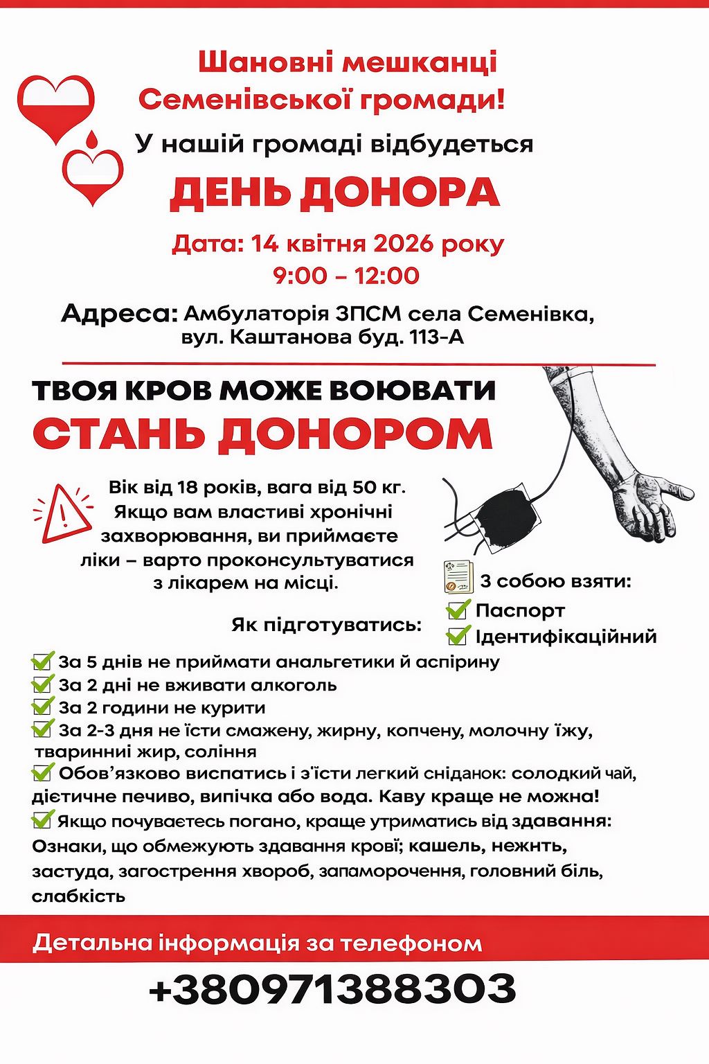 Шановні мешканці Семенівська громада ! У нашій громаді відбудеться ДЕНЬ ДОНОР…