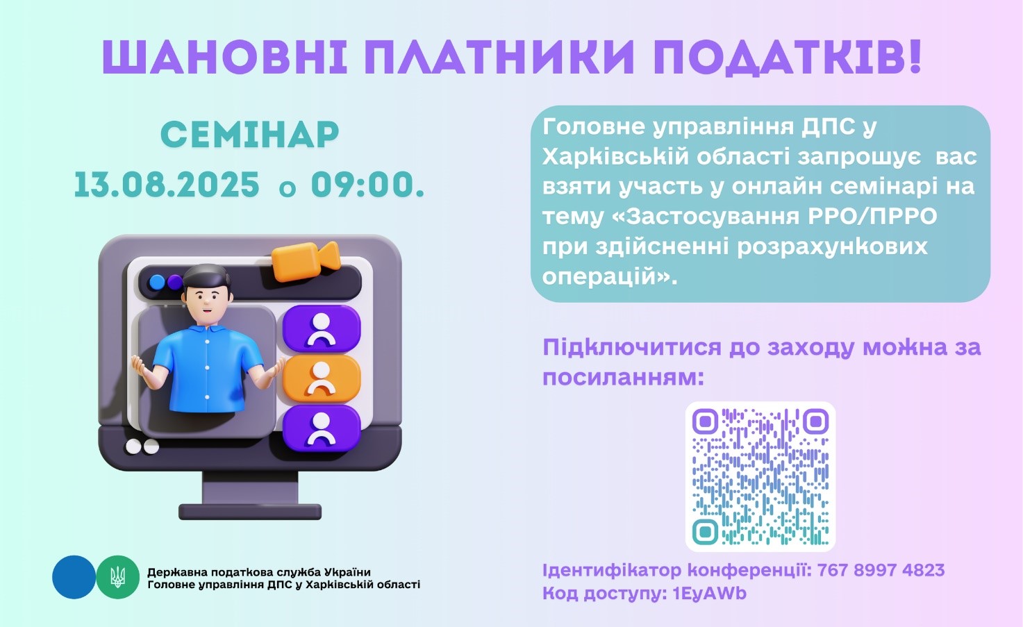 Головне управління ДПС у Харківській області запрошує вас 13.08.2025 взяти участь у онлайн семінарі на тему: «Застосування РРО/ПРРО при здійсненні розрахункових операцій».