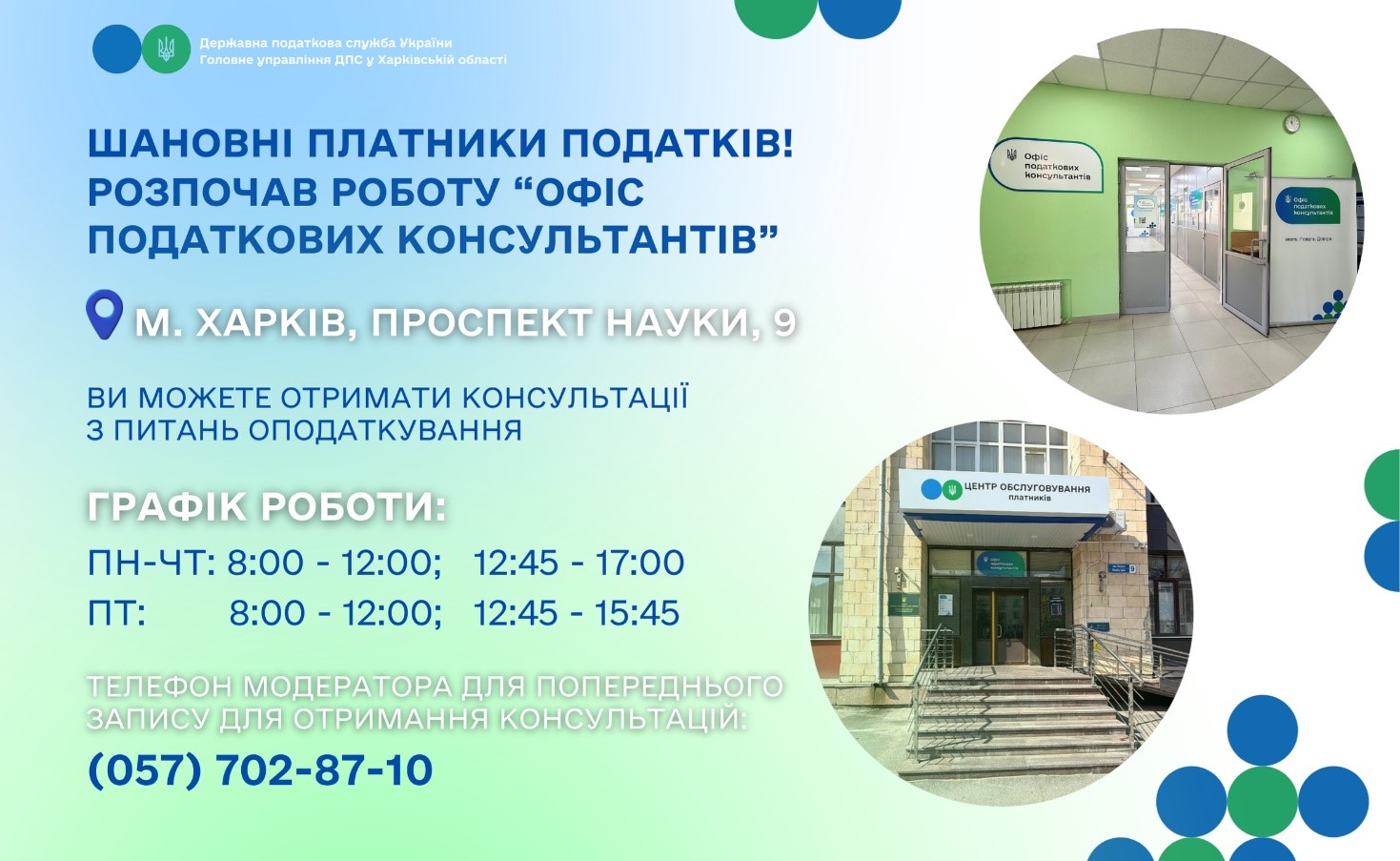 Шановні платники податків! Раді повідомити, що у місті Харків розпочала свою роботу важлива ініціатива – робоча група «Офіс податкових консультантів». Цей проєкт створено за безпосередньою ініціативою Державної податкової служби України, що свідчить про прагнення до покращення взаємодії з платниками податків та надання якісної допомоги. Новий «Офіс податкових консультантів» розташований за адресою: м. Харків, проспект Науки, 9. Це зручне місцезнаходження дозволить платникам податків як самого Харкова, так і області, легко отримати необхідні консультації з актуальних питань оподаткування. Розуміючи важливість своєчасної та професійної допомоги, «Офіс податкових консультантів» працюватиме за наступним графіком, щоб забезпечити максимальну доступність для відвідувачів: Понеділок – четвер з 8:00 до 17:00, з перервою на обід з 12:00 до 12:45. П’ятниця – з 8:00 до 15:45, також з перервою з 12:00 до 12:45. Такий розклад дозволить охопити більшість робочого часу, надаючи можливість зручно спланувати візит. Для попереднього запису та гарантованого отримання консультації, платникам податків пропонується звертатися за телефоном модератора: (057) 702-87-10. Це допоможе оптимізувати процес та уникнути довгого очікування. Важливо пам’ятати, що розуміння податкового законодавства є ключовим для успішної діяльності будь-якого бізнесу чи приватної особи. «Офіс податкових консультантів» покликаний стати надійним партнером у цій сфері, надаючи роз’яснення та поради, які допоможуть уникнути помилок та ефективно керувати своїми податковими зобов’язаннями. Звертайтеся за професійною допомогою!