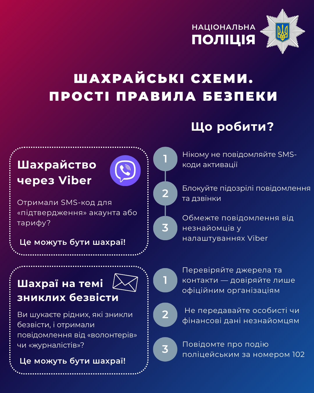 Одним із поширених методів шахрайства є видавання себе за представників служби підтримки, які пропонують допомогу у вирішенні складних ситуацій. Вони можуть просити надіслати код із Viber або ділитися фальшивими обіцянками допомогти знайти зниклих безвісти. Будьте пильні! Їх справжня мета – вкрасти ваш обліковий запис або виманити гроші та особисту інформацію.