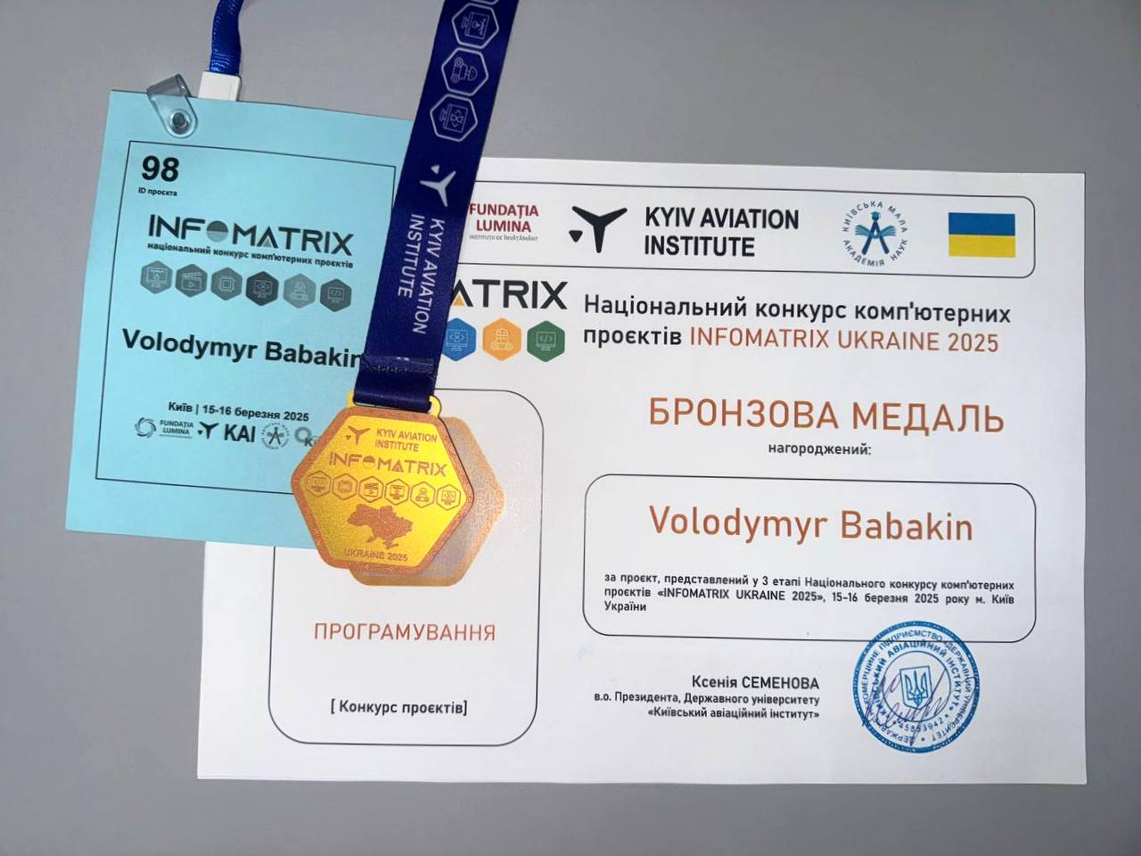У конкурсі «Infomatrix Ukraine 2025» цього року перемогли 139 проєктів з 17 областей України та Києва. У категорії «Програмування» було визначено 35 переможців з 79 учасників. Конкуренція була надзвичайно високою, оскільки серед учасників були учні спеціалізованих шкіл з різних міст. Володимир Бабакін зумів гідно представити свій ліцей і здобути призове місце, що є великим досягненням. Його проєкт вирізнявся інноваційністю та практичною цінністю.