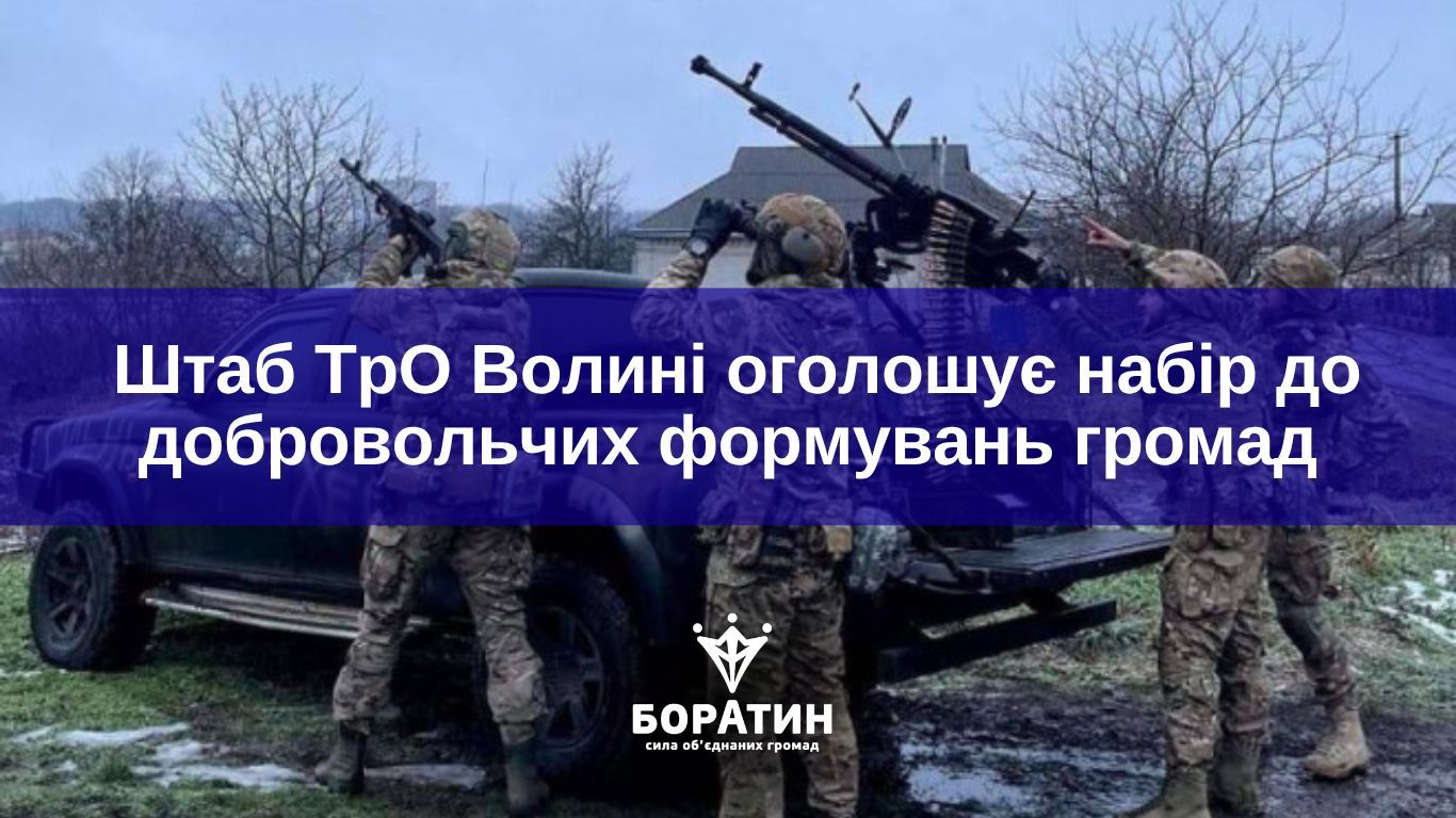 Штаб зони територіальної оборони Волинської області запрошує мешканців Боратинської громади поповнити ряди добровольчих формувань. Інформацію про це опубліковано на сайті Волинської ОВА.