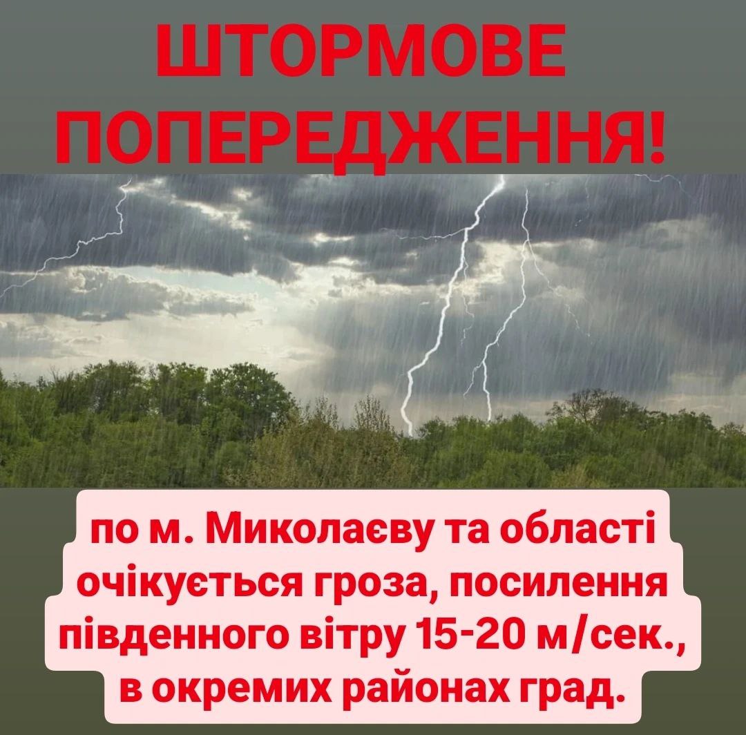 На Миколаївщину насувається негода: оголошено штормове попередження. За інформацією обласного центру з гідрометеорології, 28 липня 2025 року, орієнтовно о 15:56, місто Миколаїв та область потраплять під вплив потужної грози. Синоптики прогнозують значне посилення південного вітру, швидкість якого сягатиме 15-20 метрів за секунду. Окремі райони можуть постраждати від граду. Несприятливі погодні умови, включаючи грозу та сильний вітер, очікуються до кінця дня 28 липня та протягом усієї доби 29 липня 2025 року. Рівень небезпечності оголошено як «Жовтий», що відповідає першому рівню.
