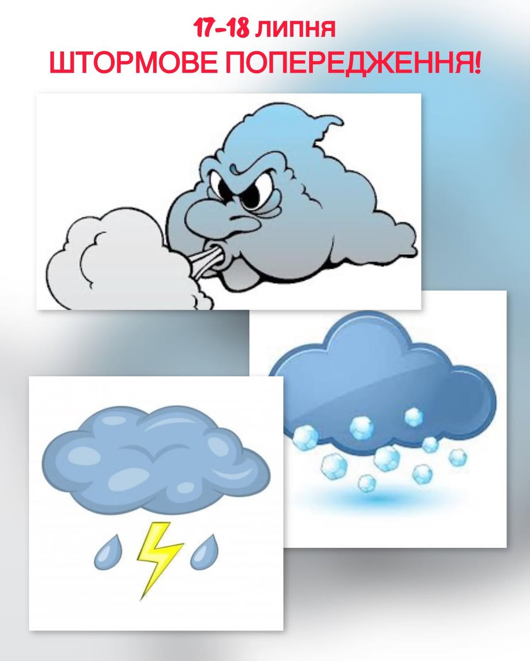 На 17-18 липня для міста Чернігова та всієї Чернігівської області оголошено **штормове попередження**. За прогнозами синоптиків, у ці дні на території регіону очікуються значні погодні зміни: сильні грози, місцями можливий град, а також посилення вітру до небезпечних значень – 15-20 метрів за секунду. Такі погодні умови вимагають особливої уваги та дотримання правил безпеки.
