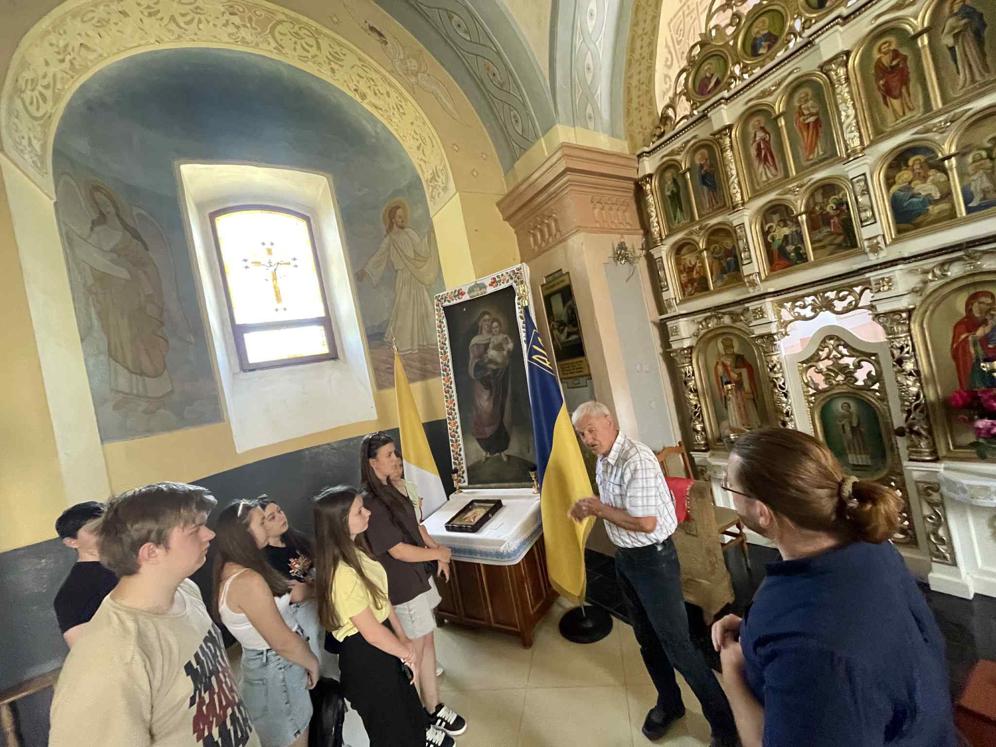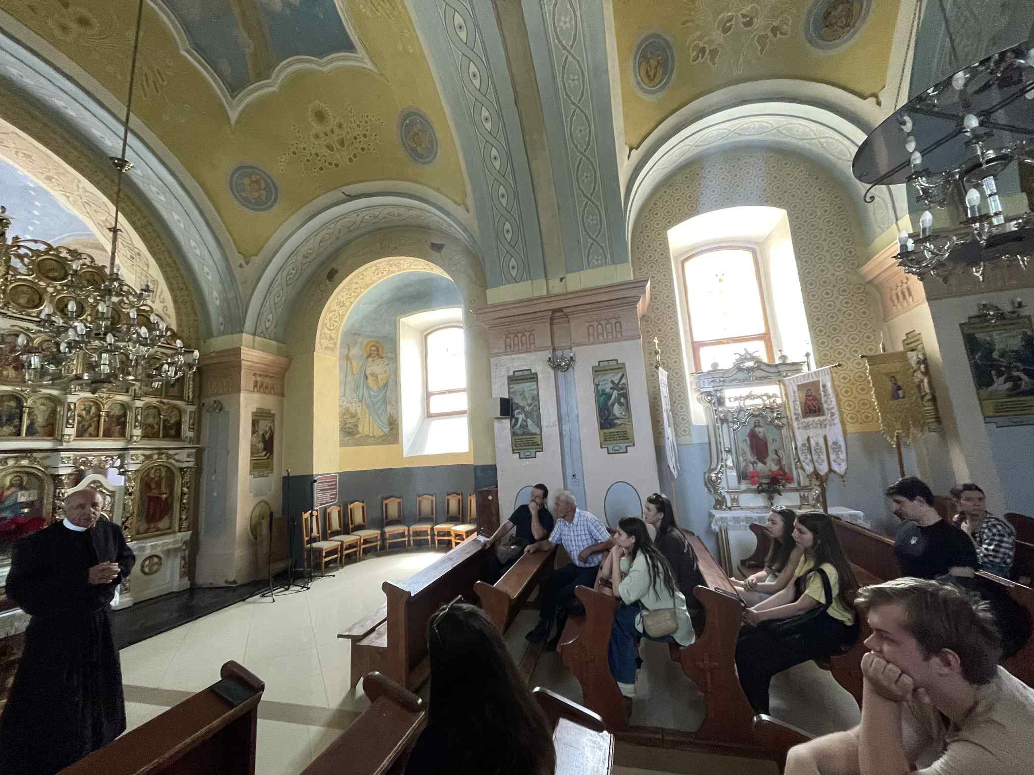 ​Варто відзначити, що в Білках студенти мали розмову з настоятелем греко-католицького храму о. Віталієм Шелембою. Зокрема, він розповів деталі розпису храму, період, коли церква була музеєм атеїзму, хрест тверезості на території обителі, мученика Павла-Петра Ороса тощо.