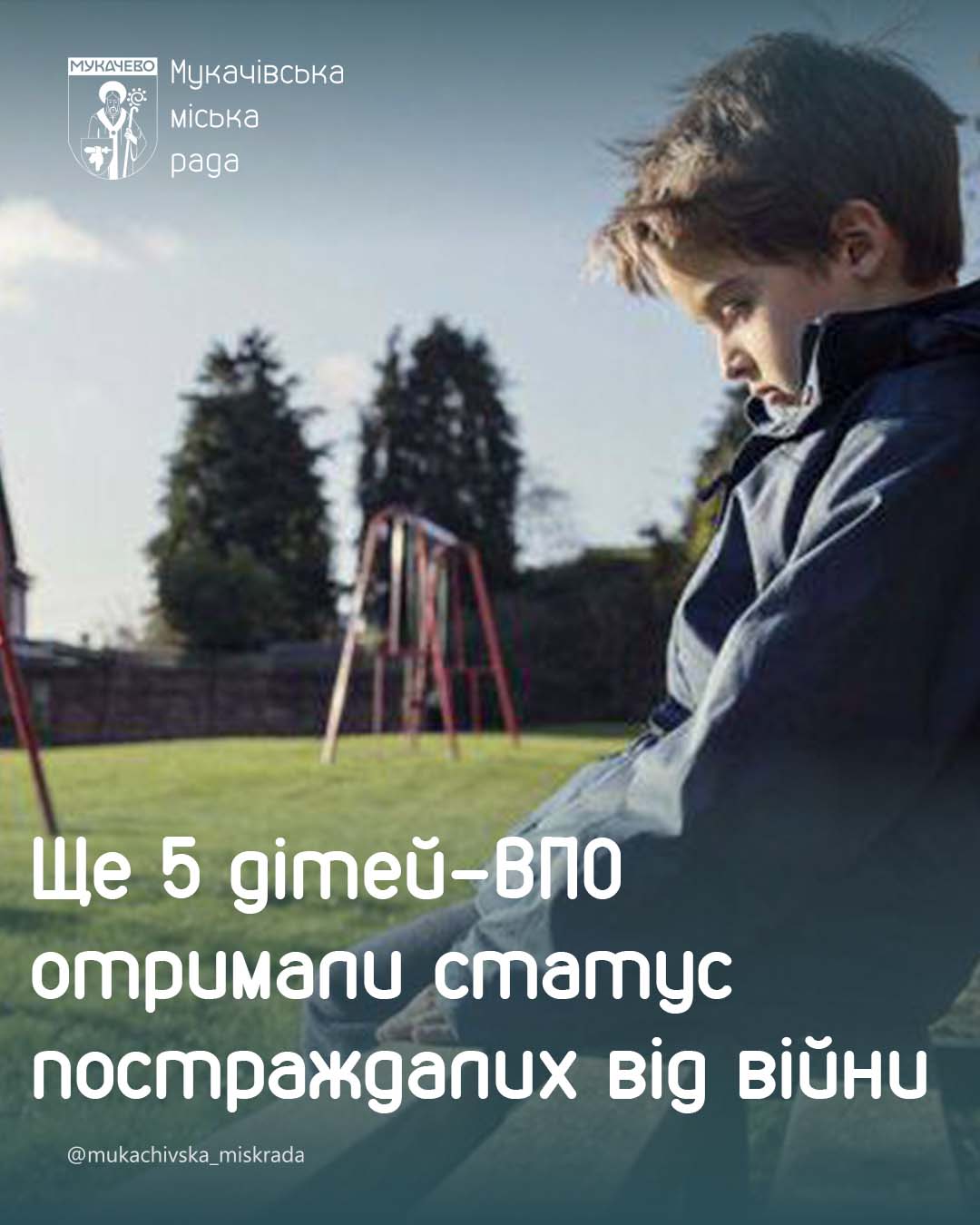 П’ятеро дітей отримали статус постраждалих від війни. Відповідне рішення ухвалили на засіданні виконавчого комітету, що відбулося 8 липня. Це діти з числа внутрішньо переміщених осіб, які приїхали до Мукачева з регіонів, що постраждали від бойових дій внаслідок військової агресії рф.