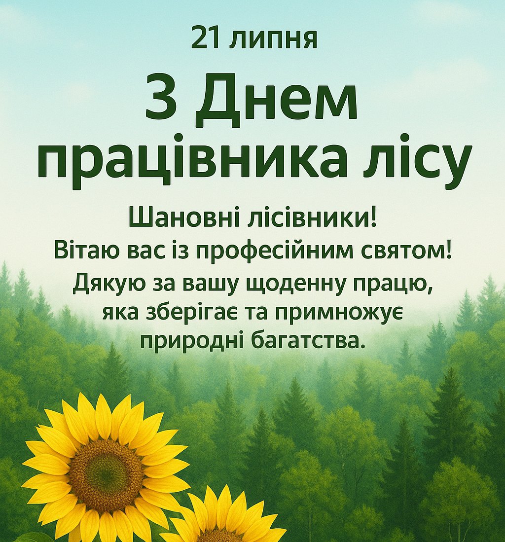 Сьогодні ми відзначаємо свято, яке об’єднує всіх небайдужих до проблем лісового господарства. Це день тих, хто своєю щоденною працею та турботою сприяє збереженню та примноженню наших зелених легенів. Ми щиро вітаємо лісівників, екологів, природоохоронців, а також усіх, хто любить, береже та рятує ліс. Ваша відданість справі є неоціненною для майбутніх поколінь.
