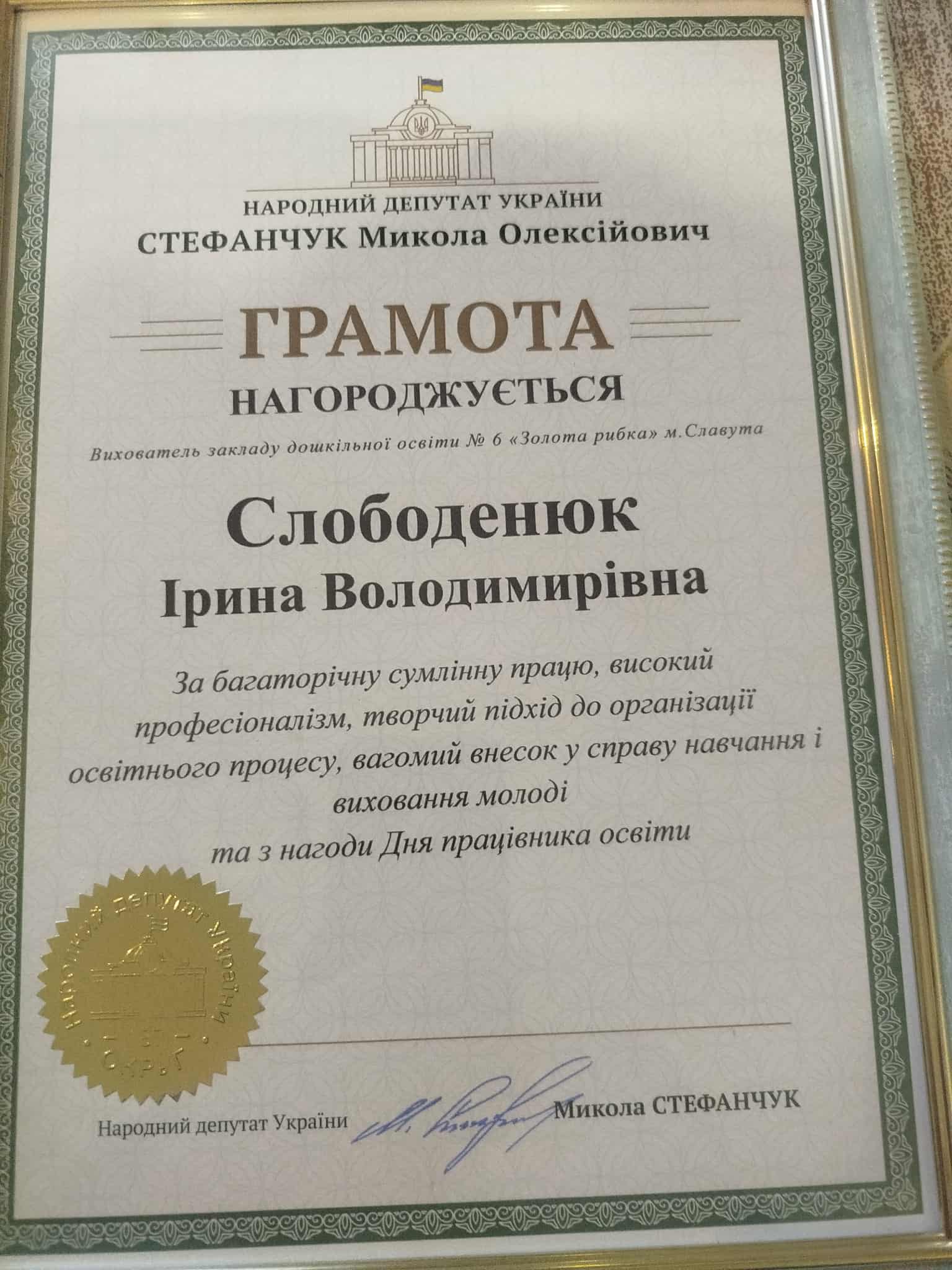 Щиро вітаємо колегу, вихователя ЗДО №6 “Золота рибка” Слободенюк Ірину Володимирівну із заслуженою нагородою, врученою під час освітнього форуму “Будуємо майбутнє: освітні тренди”.