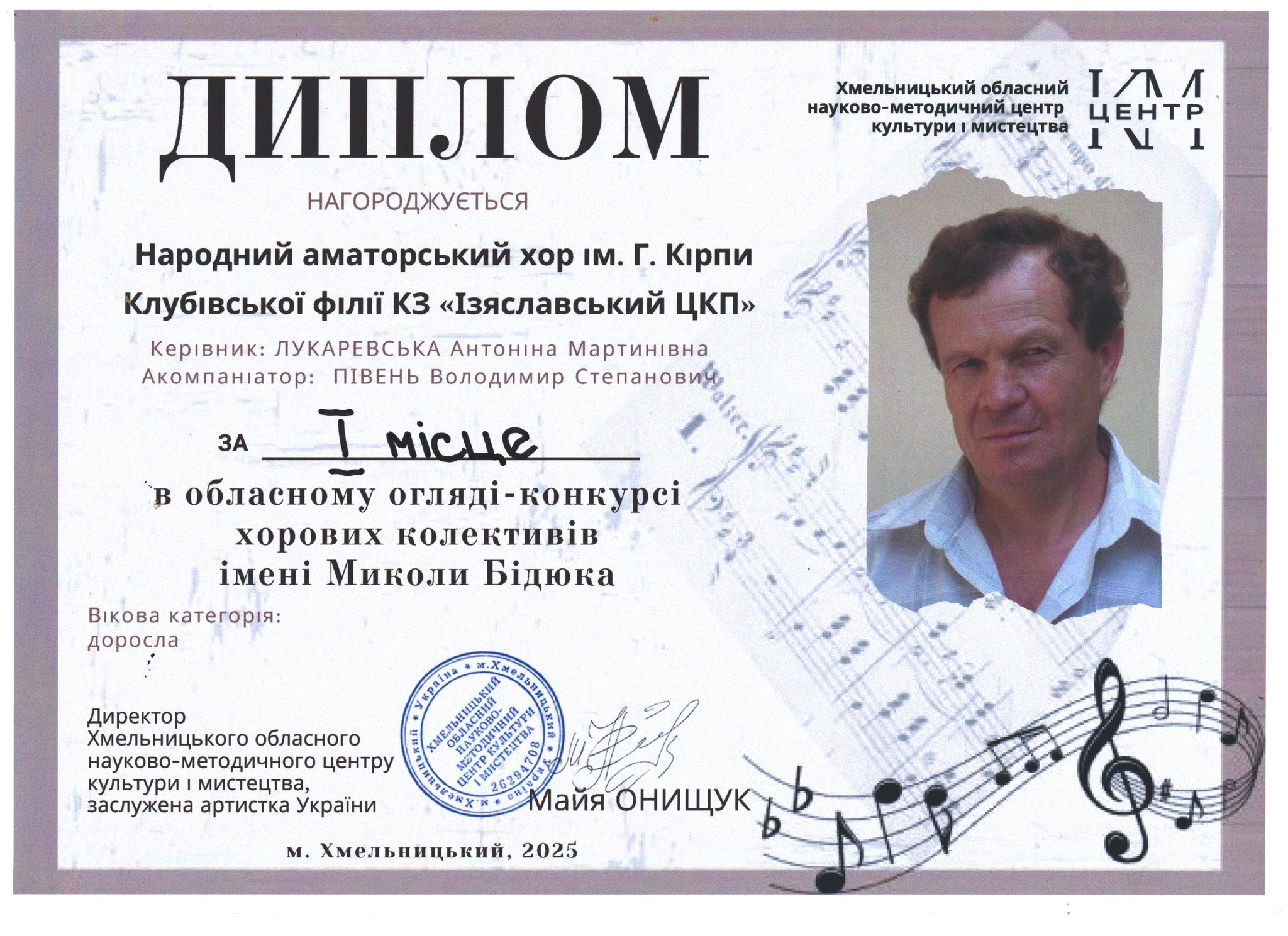 Визначний день для культурного життя Ізяславщини! Народний аматорський хор ім. Георгія Кірпи Клубівської філії КЗ “Ізяславський центр культурних послуг” здобув чергову вагому нагороду, що підкреслює високий рівень виконавської майстерності та значний внесок у збереження української пісенної спадщини. Ця відзнака є яскравим свідченням плідної праці та невтомного ентузіазму колективу, а також його керівника – талановитої Антоніни Лукаревської.