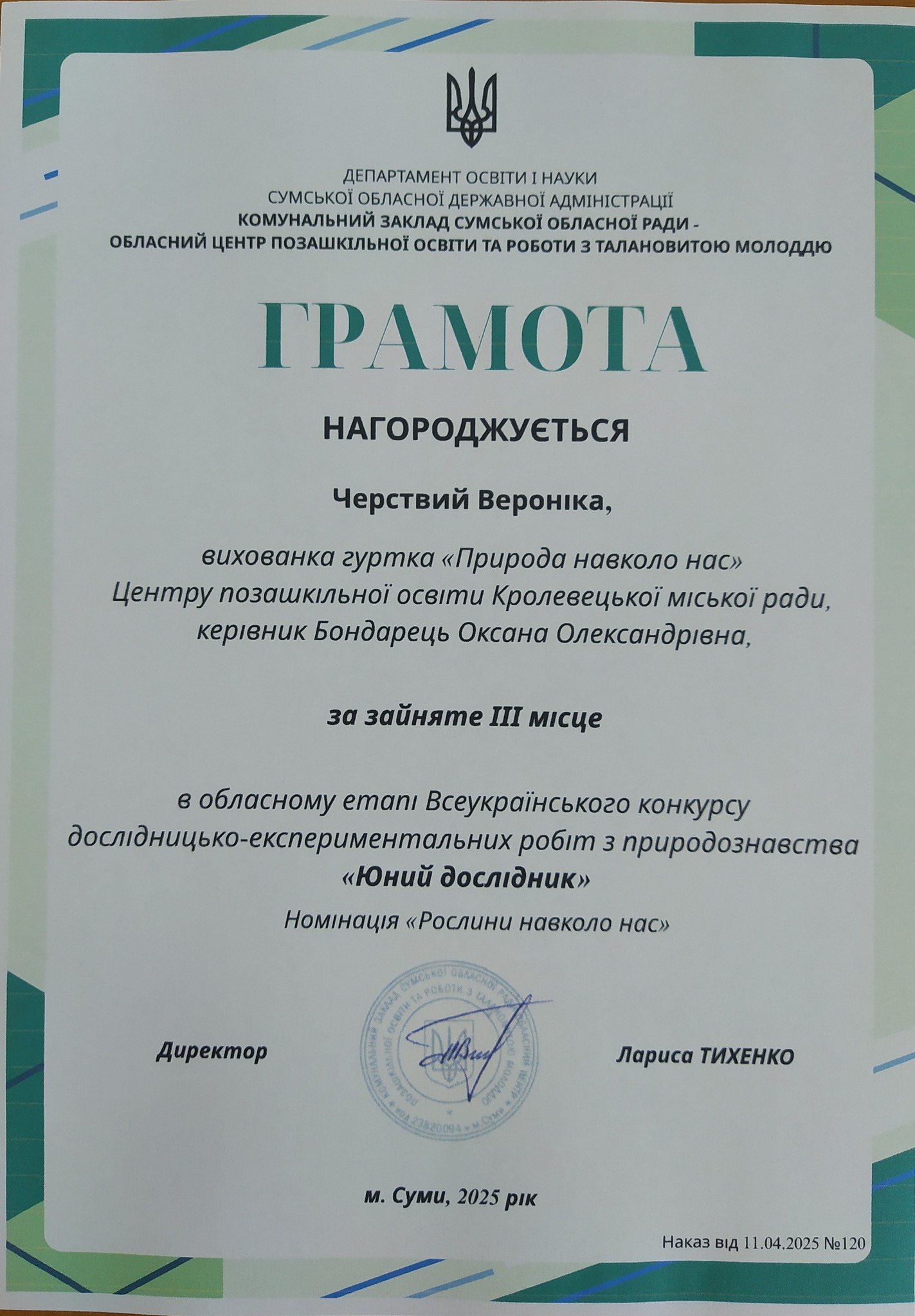 🤩 Вітаємо Вероніку Черстий, вихованку еколого-натуралістичного напряму, яка здобула 🥉 ІІІ місце у обласному етапі Всеукраїнського конкурсу дослідницько-експериментальних робіт з природознавства “Юний дослідник”! Її наставником є Оксана Бондарець. 🌱🌿☘️🍃