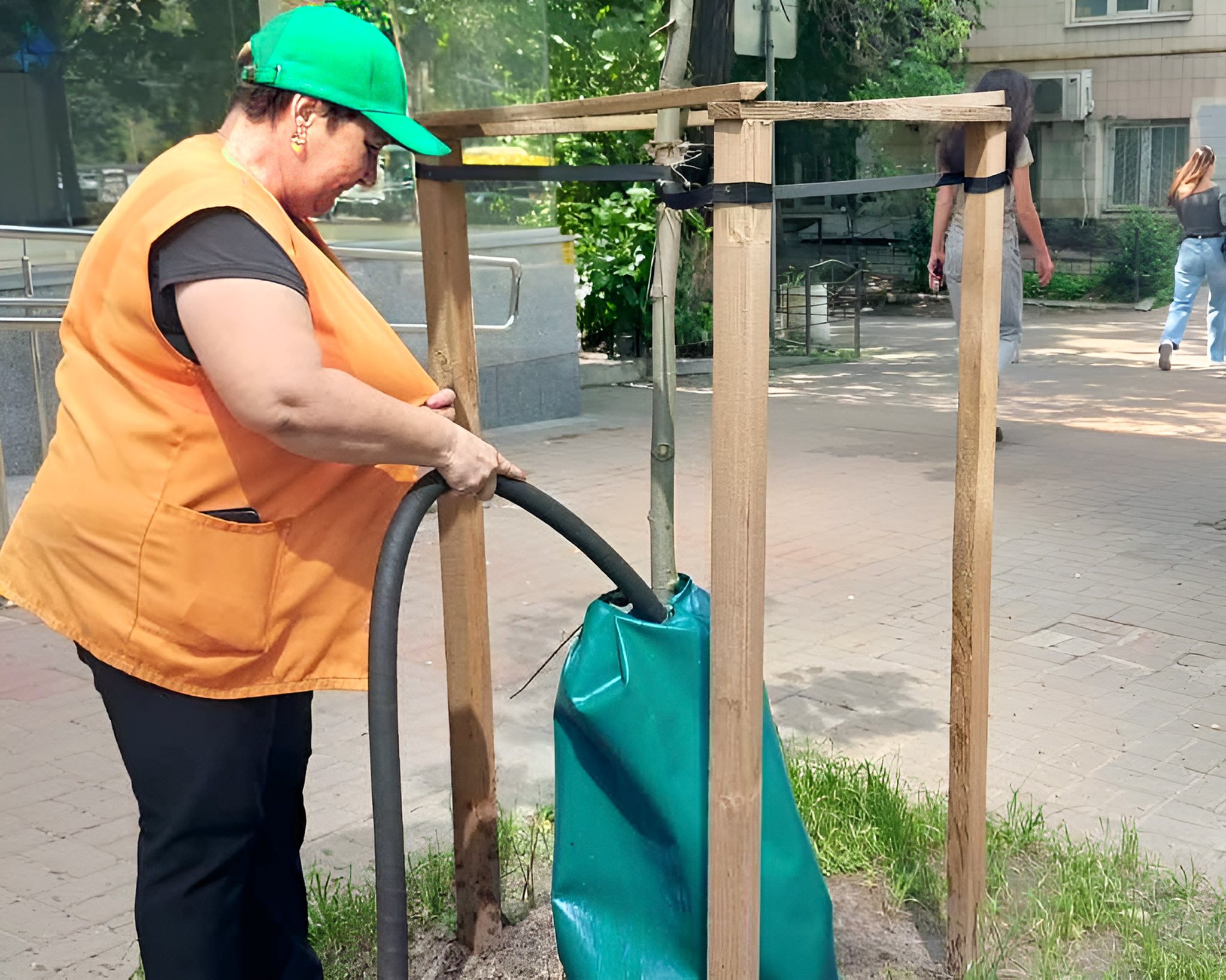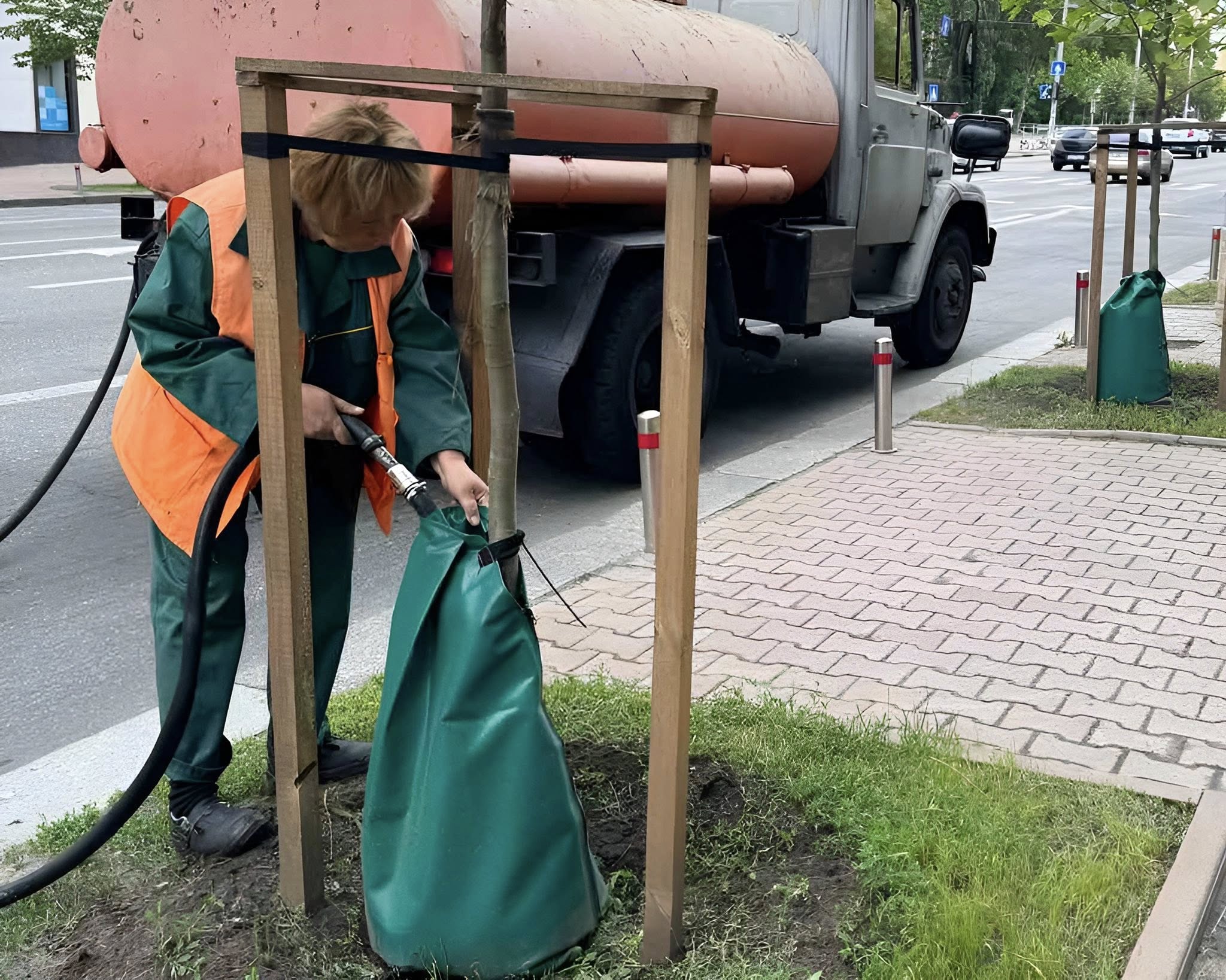 У періоди спекотної погоди або значної посухи рекомендується заповнювати поливальні мішки 1-2 рази на тиждень. Частота залежить від конкретних погодних умов, типу ґрунту та індивідуальних потреб рослини. Такий режим поливу сприяє глибокому зволоженню, що є особливо важливим для саджанців, які тільки починають укорінюватися.