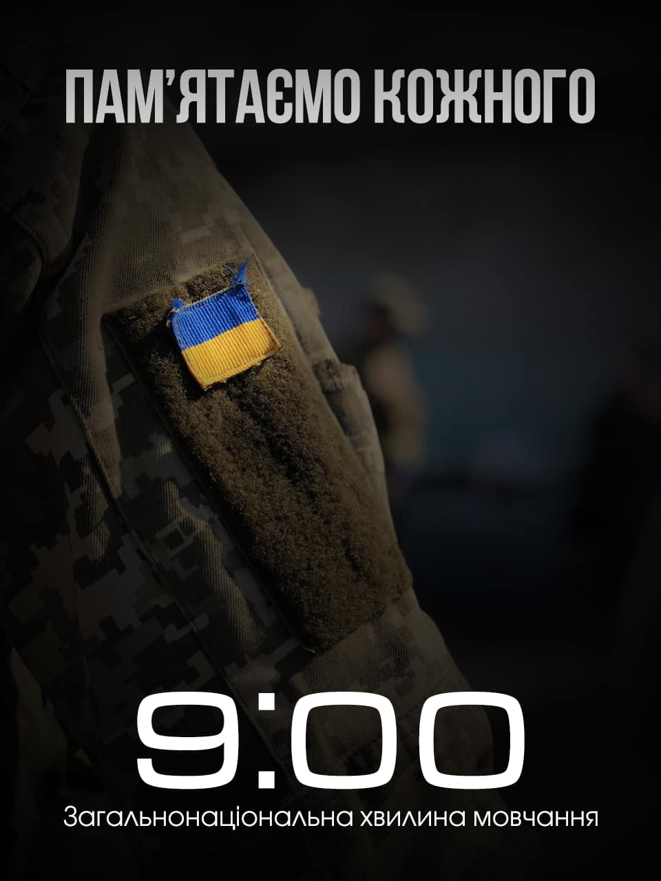 Щодня о 9:00 в Україні вшановують пам’ять загиблих внаслідок збройної агресії Російської Федерації. Ця загальнонаціональна хвилина мовчання є даниною поваги кожному, хто віддав своє життя за свободу та незалежність нашої держави. Ми схиляємо голови у глибокій скорботі за всіма захисниками і захисницями, мирними громадянами, усіма, хто боровся за Україну і поклав на вівтар цієї боротьби найцінніше — своє життя. Цей момент єднає всю країну в спільному переживанні втрати та вдячності тим, хто стояв на захисті нашої землі. Пам’ять про їхній подвиг житиме вічно. Ми ніколи не забудемо їхньої жертви та їхньої відваги. Слава Україні! Героям слава!
