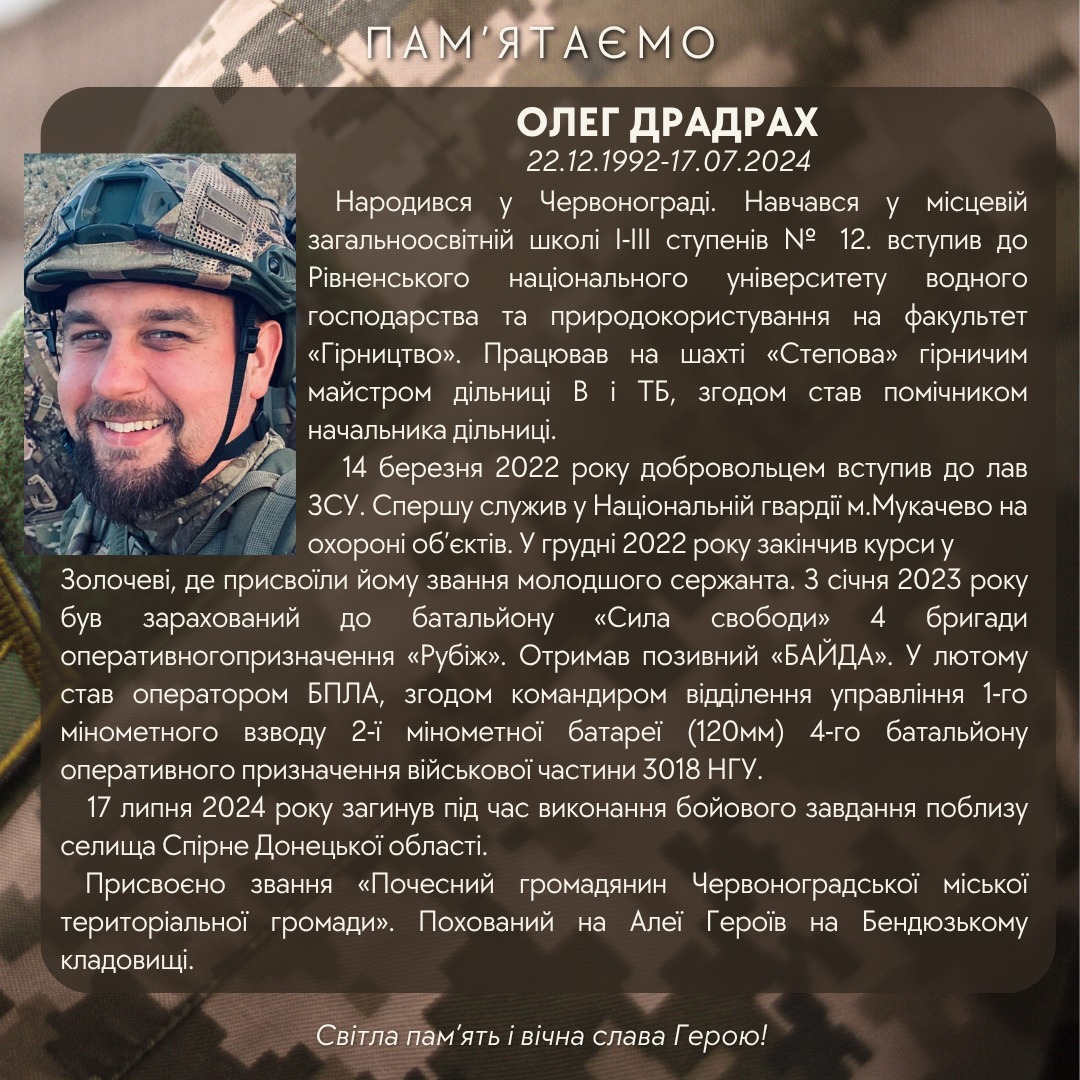 Сьогодні минає рік з дня загибелі Захисника України Олега Драдраха. У цю скорботну мить схиляємо голову перед Героєм, який віддав найцінніше – власне життя за незалежність України та за кожного з нас.