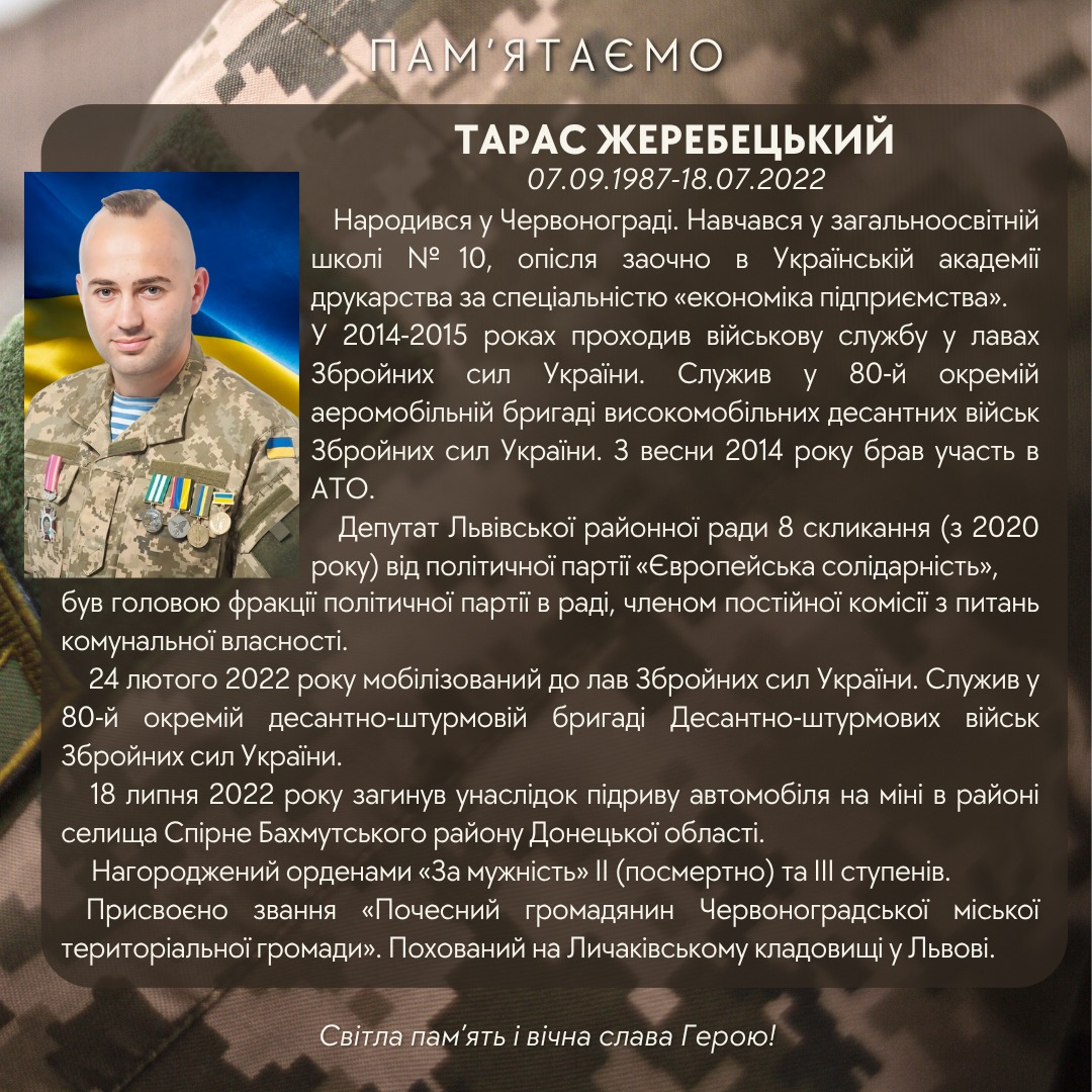 Сьогодні виповнюється три роки від дня героїчної загибелі мужніх Захисників України Тараса Жеребецького та Назара Яремковича. Також минув рік від дня, коли відійшов у вічність незламний Воїн Володимир Іваневич. У цій пам’ятній миті ми низько схиляємо голови перед усіма Героями, які пожертвували найціннішим – своїм життям заради мирного неба над нашими головами та безпеки кожного українця. Їхній подвиг назавжди залишиться в наших серцях та в історії України.