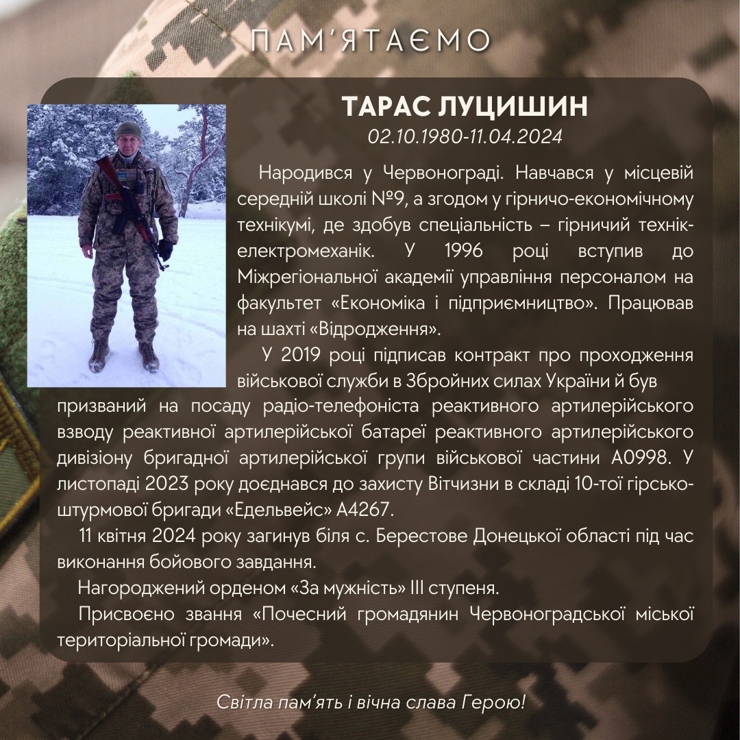 Вічна слава Захиснику України, Герою Тарасу Луцишину! Його мужність та самопожертва є прикладом для прийдешніх поколінь. Ми дякуємо тобі, Тарасе, за твій подвиг. Ми ніколи не забудемо. Спочивай з миром.
