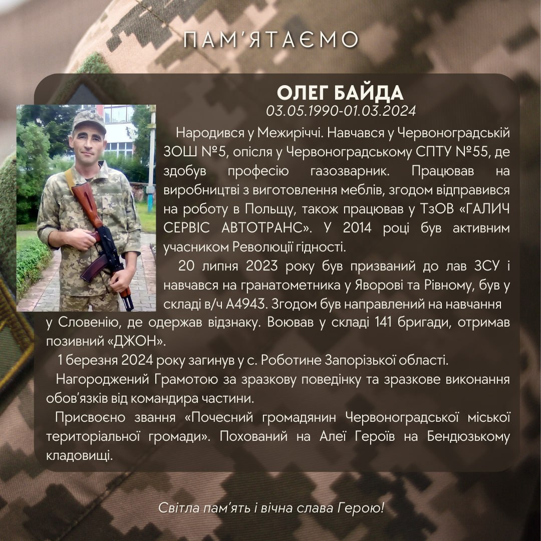 Вічна пам’ять і вічна слава Захиснику України Олегу Байді! Його ім’я та його подвиг будуть жити в наших серцях і в історії нашої держави. Ми зобов’язані пам’ятати таких героїв, адже саме завдяки їм ми маємо можливість жити, творити і мріяти. Нехай пам’ять про полеглих воїнів завжди буде з нами, як нагадування про ціну, яку заплатила Україна за свою свободу.