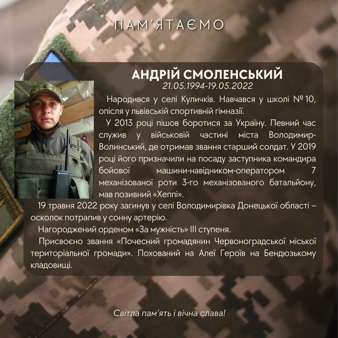 Ми ніколи не забудемо тих, хто боровся за Україну. Їхні імена назавжди залишаться в нашій пам’яті. Вшанування пам’яті Героїв – це не просто традиція, це вияв нашої поваги та любові до тих, хто віддав життя за нас. Слава Україні! Героям слава! Вічна пам’ять Андрію Смоленському та всім полеглим Захисникам.
