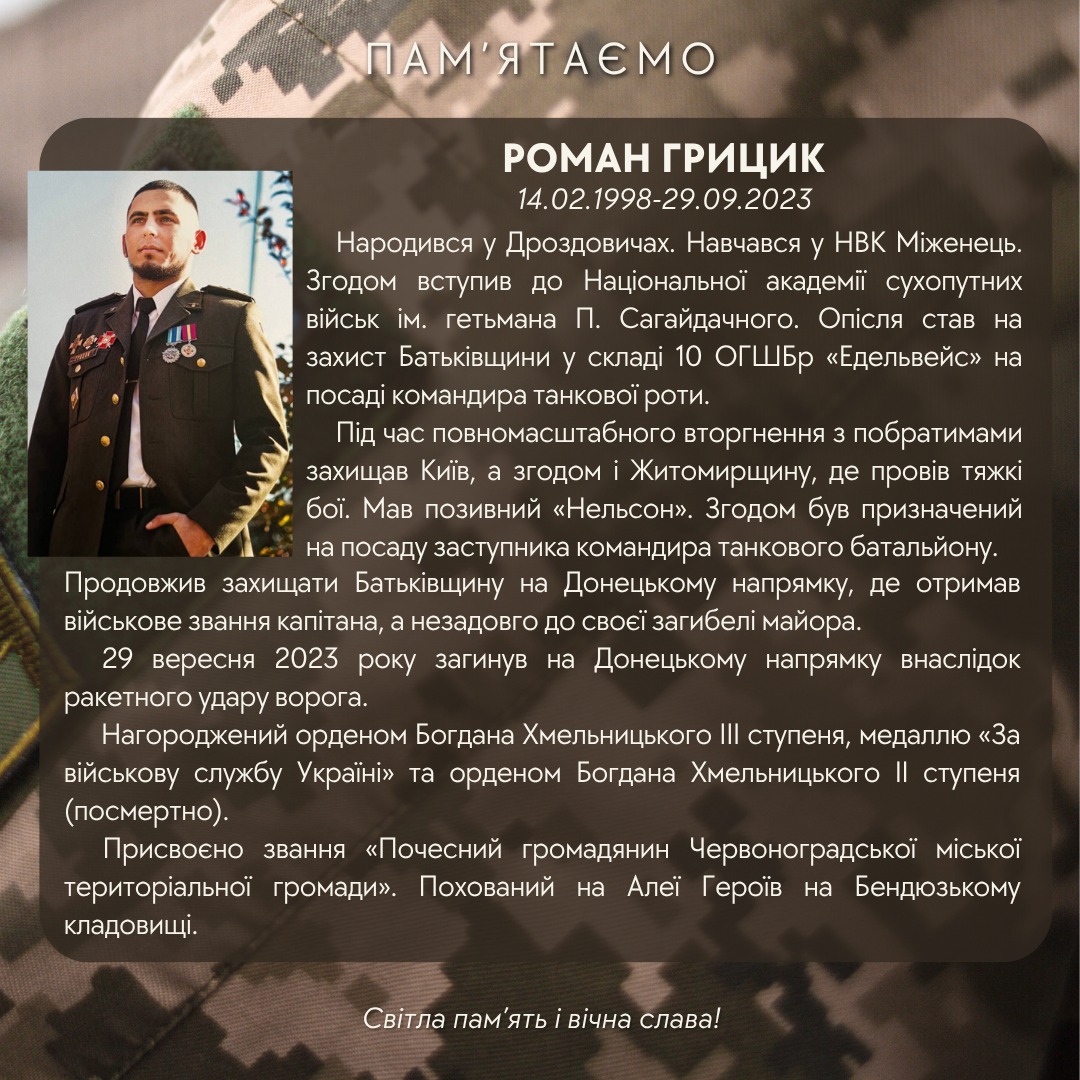 Сьогодні, в цю скорботну мить, ми схиляємо голови перед світлою пам’яттю Героя Романа Грицика. Його ім’я вписане золотими літерами в літопис нашої незламної боротьби. Роман Грицик – один із тих відважних воїнів, хто без вагань став на захист рідної землі, своєї родини та майбутнього України. Його жертовність є прикладом непересічної мужності та самовідданості, що назавжди залишиться в серцях українців. Його подвиг – це не лише особиста трагедія, а й потужний стимул для всіх нас продовжувати боротьбу за свободу та незалежність.