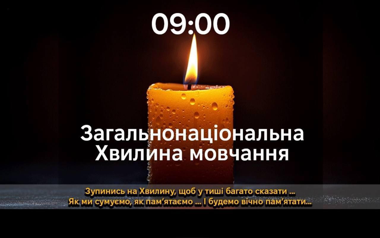 Щоранку о 09:00 ми зупиняємось, щоб вшанувати пам’ять тих, хто віддав своє життя за нашу свободу. Це загальнонаціональна хвилина мовчання – час, коли ми згадуємо кожного полеглого від рук російських загарбників. Ми схиляємо голови у скорботі, вшановуючи світлу пам’ять громадян України, які віддали життя за свободу і незалежність нашої держави. Це час пам’яті, час скорботи, час єднання.