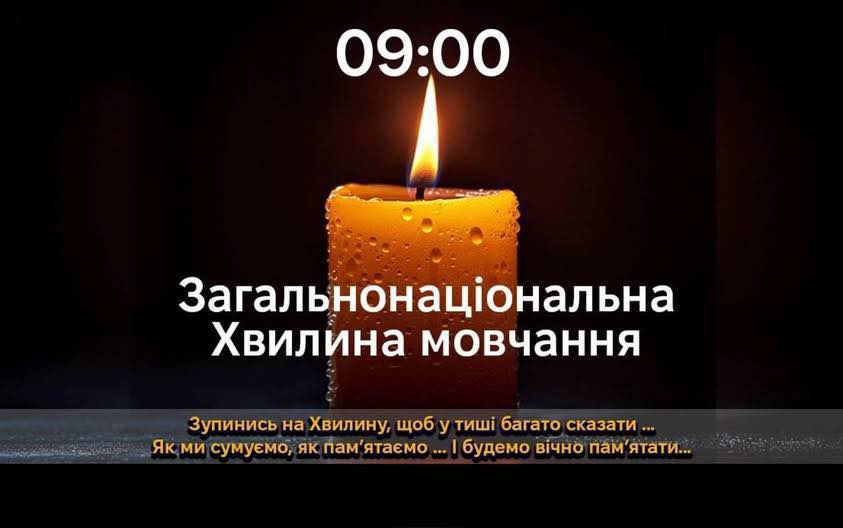 🕯Щоранку о 09:00 ми згадуємо загиблих від рук російських загарбників, щодня ми зупиняємося та схиляємо голови у скорботі під час загальнонаціональної хвилини мовчання, вшановуючи світлу пам’ять громадян України, які віддали життя за свободу і незалежність України: всіх, хто воював, всіх військових, цивільних та дітей, всіх, хто загинув у боротьбі з російськими окупантами та внаслідок нападу російських військ на українські міста і села.