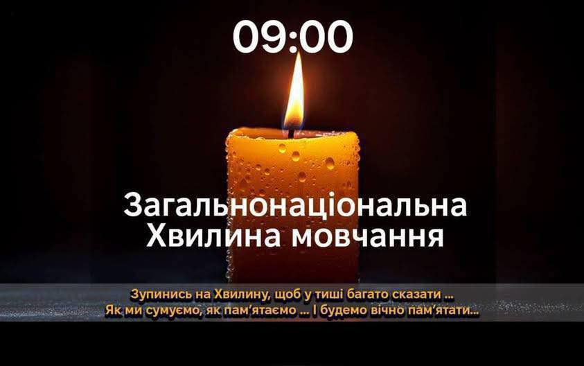 🕯Щоранку, о 09:00, ми згадуємо загиблих від рук російських загарбників. Щодня ми зупиняємося та схиляємо голови у скорботі під час загальнонаціональної хвилини мовчання, вшановуючи світлу пам’ять громадян України, які віддали життя за свободу і незалежність України: всіх, хто воював, всіх військових, цивільних та дітей, всіх, хто загинув у боротьбі з російськими окупантами та внаслідок нападу російських військ на українські міста і села.