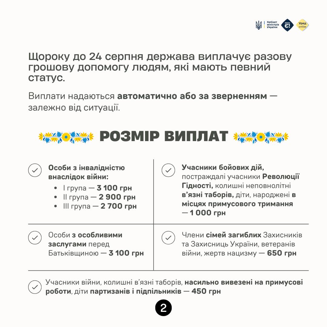 Щорічно, напередодні Дня Незалежності України, держава здійснює виплати грошової допомоги громадянам, які мають відповідний статус. Пенсіонери отримують ці кошти автоматично, проте іншим категоріям осіб необхідно особисто звернутися до Пенсійного фонду України до 1 серпня.