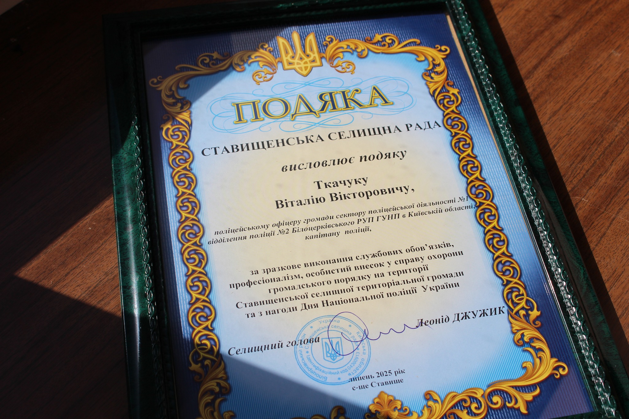 Щороку, 4 липня, Україна урочисто відзначає професійне свято — День Національної поліції. Це важлива дата, що підкреслює ключову роль правоохоронців у забезпеченні миру, порядку та безпеки громадян. Цього дня ми вшановуємо мужність, відданість та професіоналізм кожного, хто обрав цей нелегкий шлях служіння народу України.В умовах повномасштабної агресії проти України, День Національної поліції набуває особливого, глибокого значення. Адже сьогодні поліцейські не тільки виконують свої прямі обов’язки, визначені законом, а й активно долучаються до оборони країни. Вони беруть участь у захисті територіальної цілісності, допомагають евакуювати мирне населення, документують воєнні злочини та забезпечують стабільність у прифронтових та деокупованих районах. Їхня участь у військових діях, їхня готовність ризикувати власним життям заради безпеки співвітчизників заслуговує на найвищу похвалу та вдячність. Це яскравий приклад героїзму та безкорисливого служіння, що демонструє непохитну єдність усіх українських захисників.З нагоди Дня Національної поліції України, Ставищенський селищний голова Леонід Джужик тепло привітав працівників поліції. У своїх словах він висловив побажання міцного здоров’я, благополуччя, миру та злагоди, а також подальшого професійного росту. Очільник громади підкреслив особливу вдячність за самовіддану працю правоохоронців, їхню непохитну вірність присязі та беззастережну відданість українському народові. Ці вітання є відображенням загальнонаціональної поваги до важливої місії, яку виконує Національна поліція щодня.Поліцейські завжди першими прибувають туди, де виникає небезпека, де потрібна негайна допомога та захист. Вони стоять на передовій боротьби зі злочинністю, розслідують правопорушення, підтримують громадський порядок та забезпечують спокій на вулицях міст та сіл. Їхня робота вимагає не лише високого рівня професійної підготовки, а й виняткової стійкості, мужності та здатності швидко приймати відповідальні рішення у стресових ситуаціях. День поліції — це нагода вкотре нагадати суспільству про складність та відповідальність їхньої служби.На знак визнання сумлінного виконання службових обов’язків, вагомого особистого внеску у боротьбу зі злочинністю та з нагоди Дня Національної поліції України, Ставищенський селищний голова вручив грамоти офіцерам. Це є символом вдячності від громади та держави за їхню невтомну працю. Ці нагороди підтверджують високий рівень довіри та поваги до інституту Національної поліції, який є невід’ємною частиною системи безпеки України та опорою для кожного громадянина. Важливість їхньої служби сьогодні є безпрецедентною, і ми всі маємо пам’ятати про це. Кожен поліцейський своєю щоденною працею зміцнює правопорядок та наближає нашу Перемогу.