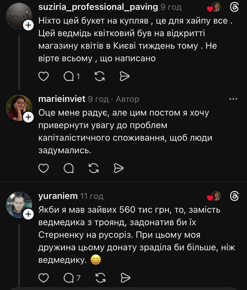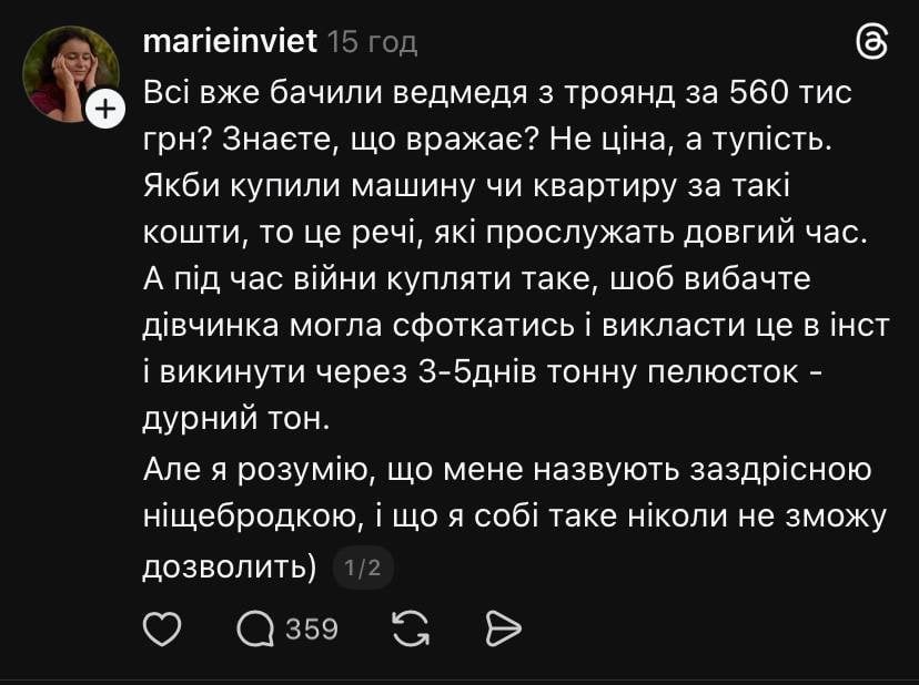 «Всі вже бачили ведмедя з троянд за 560 тисяч гривень? Знаєте, що вражає? Не ціна, а тупість. Якби купили машину чи квартиру за такі кошти, то це речі, які прослужать довгий час».