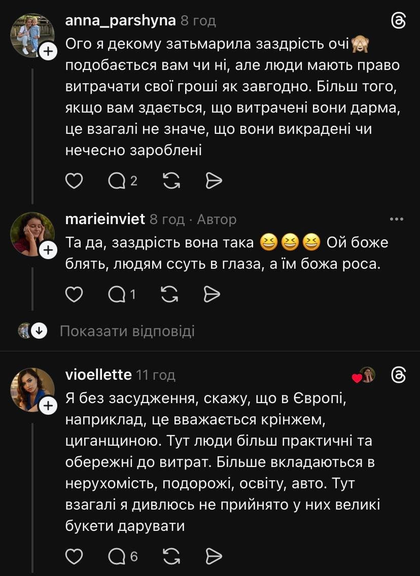 Підписи під фотографіями часто висміювали дорогий подарунок, зокрема: «У Києві хлопець подарував дівчині ведмедика з троянд за 536 тисяч гривень». Користувачі критикували замовника за марнотратство та відсутність смаку. Деякі коментарі звучали так: «Це циганщина», «За такі гроші можна було придбати авто чи квартиру, які слугуватимуть довго», а інші пропонували порівняти вартість ведмедика з ціною необхідного для ЗСУ обладнання, наприклад, FPV-дронів чи тепловізорів.