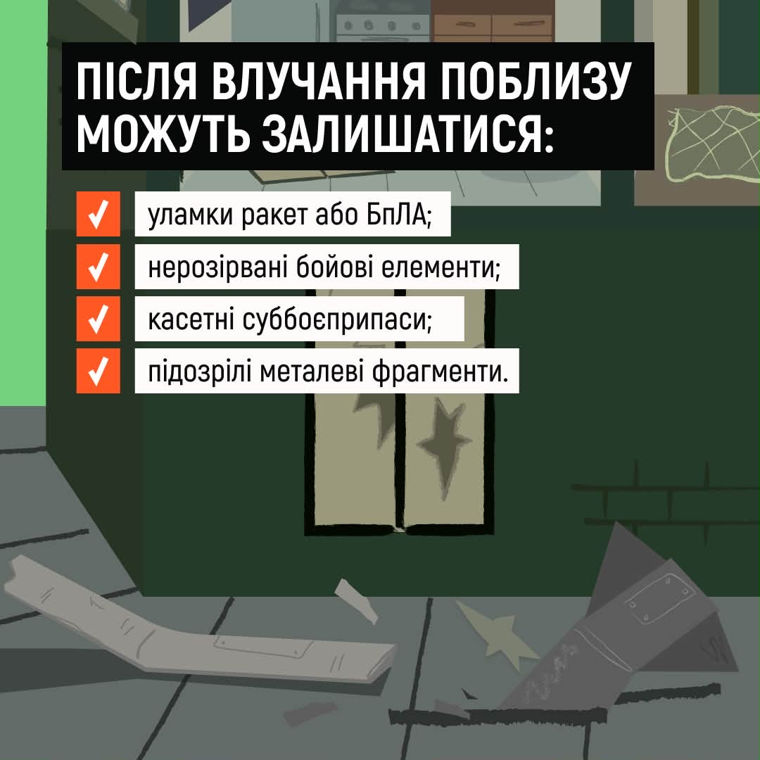 Адже навколо або навіть у вашому помешканні можуть опинитися уламки та частини вибухонебезпечних предметів!