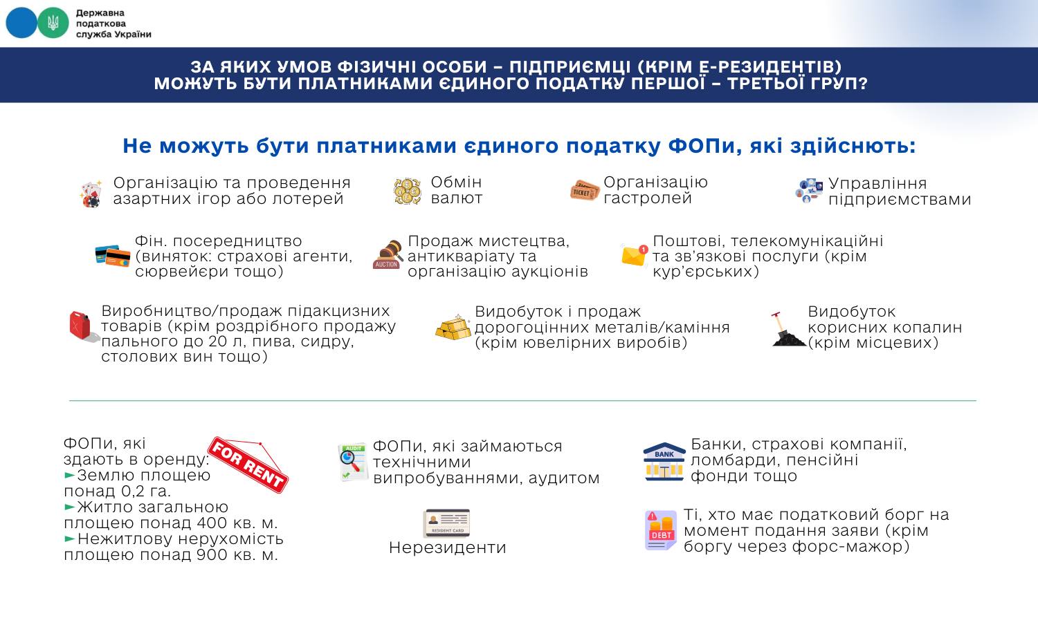 Також до платників, яким заборонено спрощену систему, належать: банки, страхові компанії, ломбарди, кредитні спілки, інші фінансові установи, реєстратори цінних паперів, фізичні особи – нерезиденти. Крім того, застосовувати єдиний податок не можуть ФОП з податковим боргом (за винятком безнадійного боргу, що виник через обставини непереборної сили).
