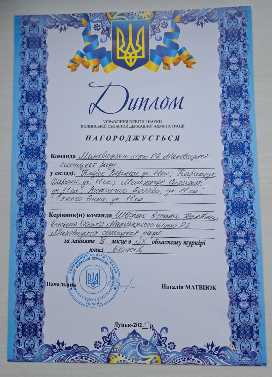 Команда Маневицького ліцею №2 здобула ІІІ призове місце на XIX обласному турнірі юних біологів. Турнір відбувся 13 травня 2025 року на базі Волинського національного університету імені Лесі Українки. Юні біологи показали високий рівень знань.