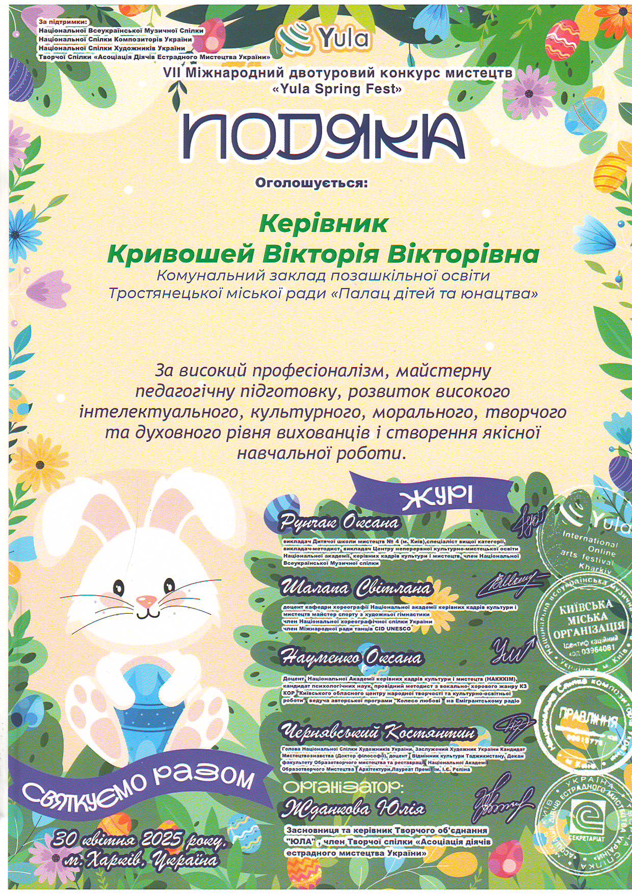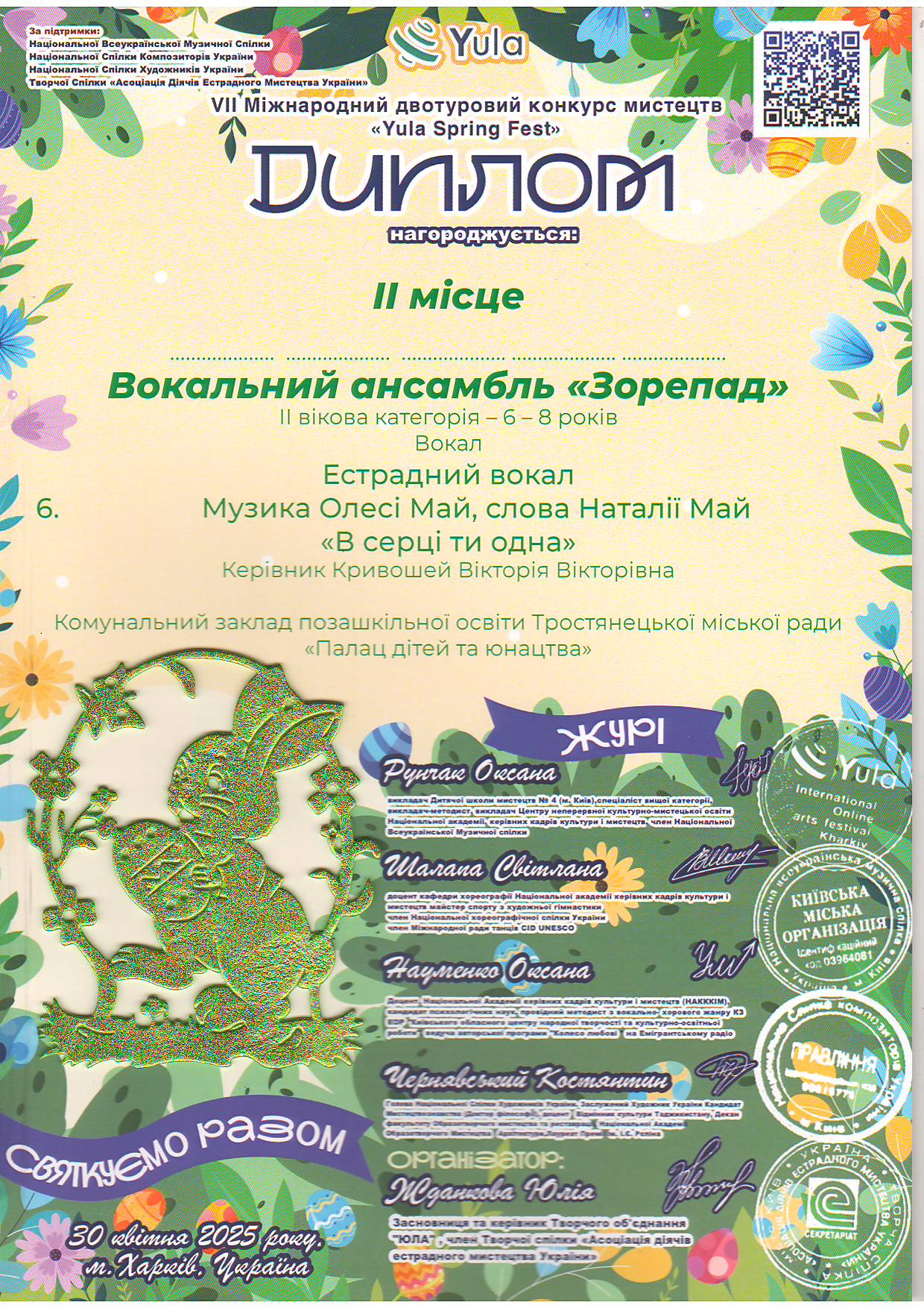 Тростянецька громада пишається своїми талантами! Молодша група вокального ансамблю «Зорепад» з Палацу дітей та юнацтва здобула визнання на VII Міжнародному двотуровому фестивалі-конкурсі мистецтв «YULA SPRING FEST». Цей престижний мистецький форум, організований Асоціацією творчого та професійного розвитку «Yula» за підтримки творчої спілки «Асоціація діячів естрадного мистецтва України», зібрав сотні учасників.