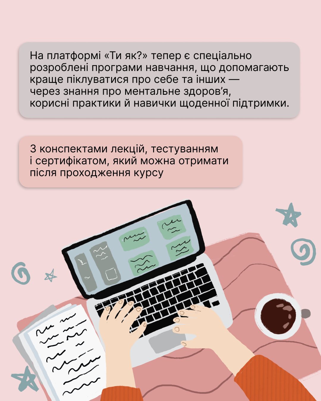 Платформа “Ти як?” – це повноцінний навчальний процес з лекціями від кваліфікованих фахівців, інтерактивними тестуваннями та можливістю отримати сертифікат після успішного завершення навчання. Кожен курс – це крок до кращого розуміння себе та ефективної допомоги іншим. Дізнайтеся більше про теми курсів та зареєструйтеся на платформі “Ти як?” за посиланням: http://howareu.com/mainpage_course?utm_source=facebook&utm_medium=post&utm_campaign=product_sm. Не втрачайте можливість інвестувати у своє емоційне здоров’я та навчитися ефективним стратегіям подолання стресу.