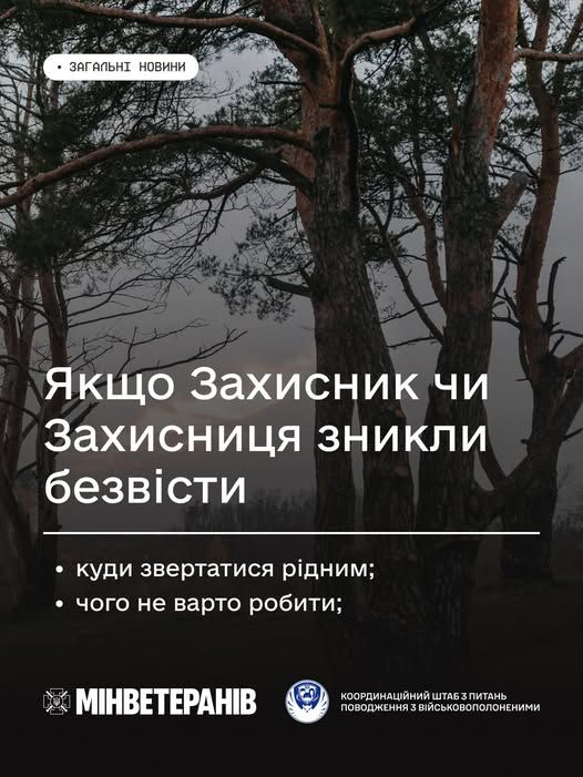 Не мати звістки від рідної людини, яка знаходиться на війні, боляче, важко й дуже тривожно. У такій ситуації надзвичайно важливо не панікувати, заручитися підтримкою інших близьких людей та діяти виважено й поетапно. Мінветеранів надає алгоритм дій для рідних зникли безвісти.