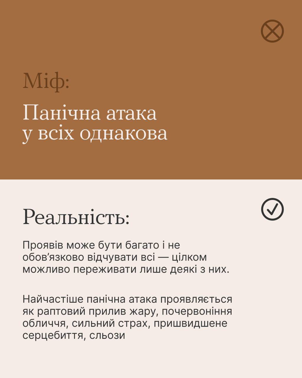 * **Міф 2: Під час панічної атаки можна померти.** Симптоми панічної атаки, такі як прискорене серцебиття, запаморочення, утруднене дихання, можуть бути дуже інтенсивними і викликати страх смерті. Однак, це лише фізіологічні прояви реакції «бий або біжи», і вони не становлять загрози життю.