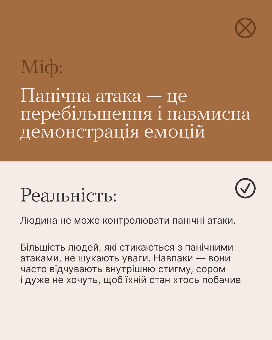 **Реальність:** Панічні атаки є симптомом, а не самостійним розладом. Вони можуть бути пов’язані з панічним розладом, але також можуть виникати як реакція на стрес, певні медичні стани або прийом деяких речовин. Важливо, що панічні атаки успішно лікуються за допомогою психотерапії (наприклад, когнітивно-поведінкової терапії) та, за потреби, медикаментозного лікування.