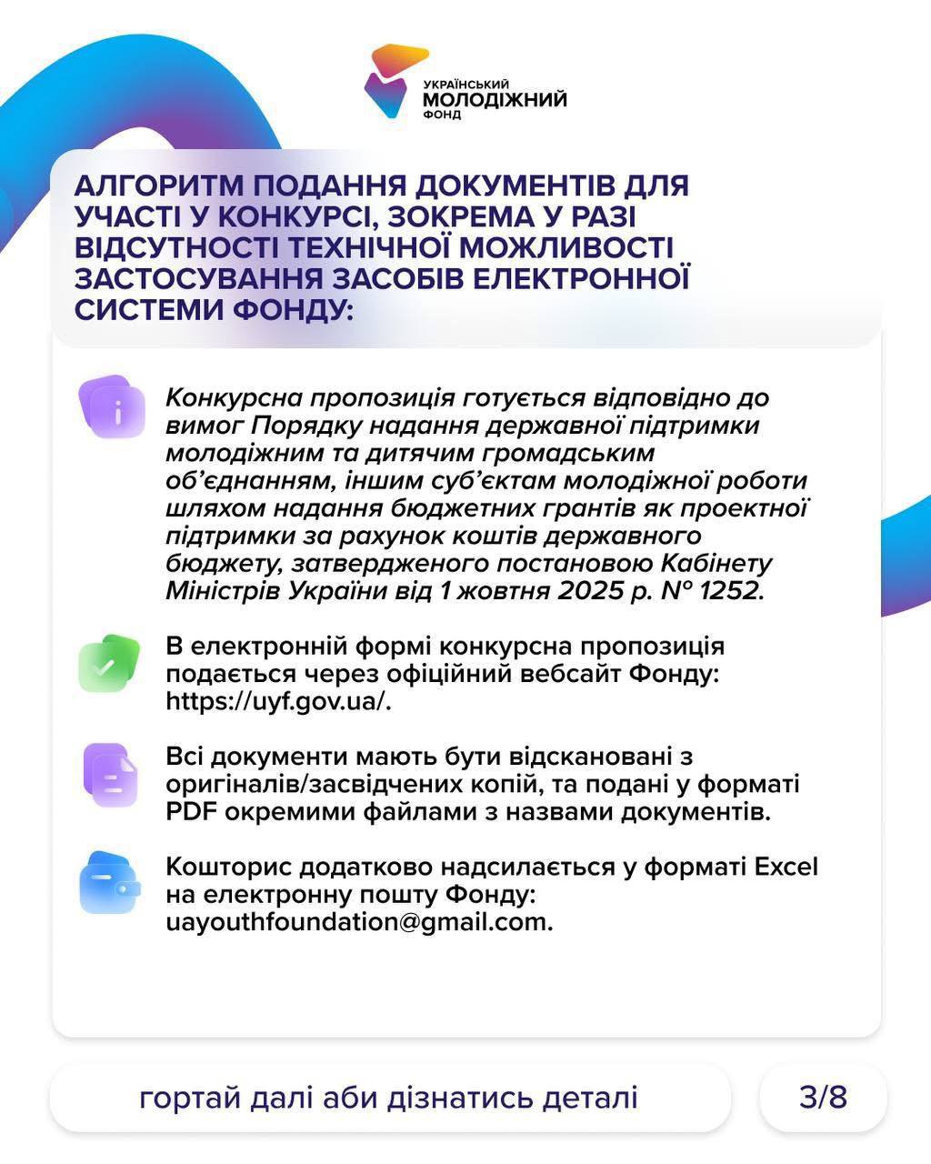 Детальна інформація щодо критеріїв участі та видів діяльності, які можна реалізувати в рамках конкурсу, розміщена на зображеннях. Для отримання повної інформації та подання заявки відвідайте офіційний сайт Українського молодіжного фонду: uyf.gov.ua.
