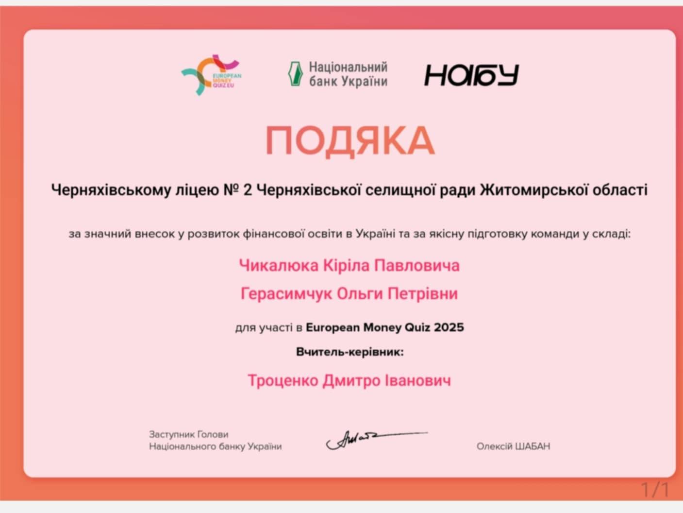 Україну представляла команда з Черняхівського ліцею № 2 Черняхівської селищної ради Житомирської області у складі Чикалюка Кіріла Павловича та Герасимчук Ольги Петрівни під керівництвом вчителя Троценка Дмитра Івановича. Вони посіли 9 місце, обійшовши команди з Німеччини, Данії, Чехії та Польщі. Вітаємо команду з Черняхова та їх вчителя з досягненням на European Money Quiz та бажаємо подальших успіхів у навчанні та розвитку фінансової грамотності!