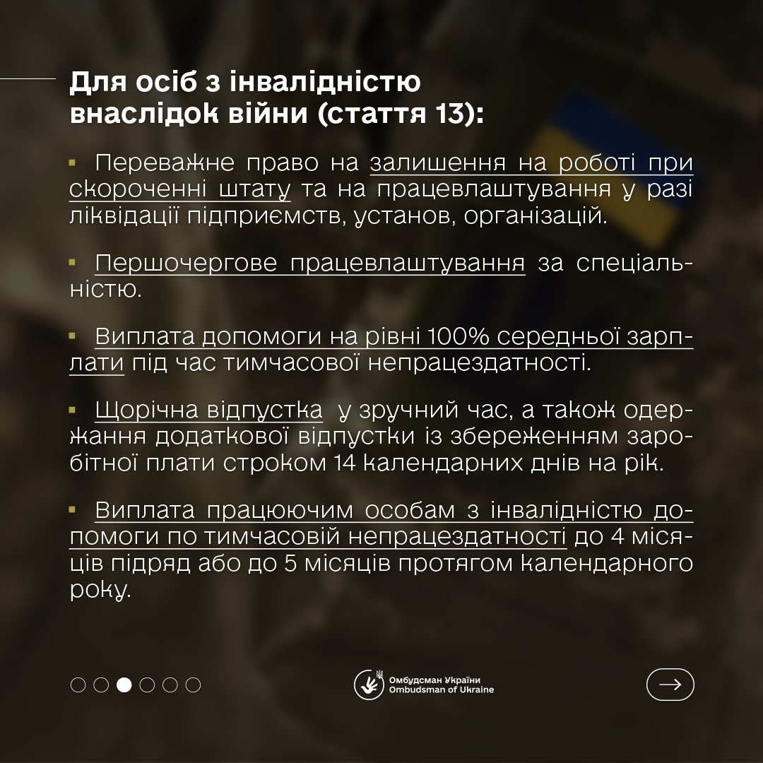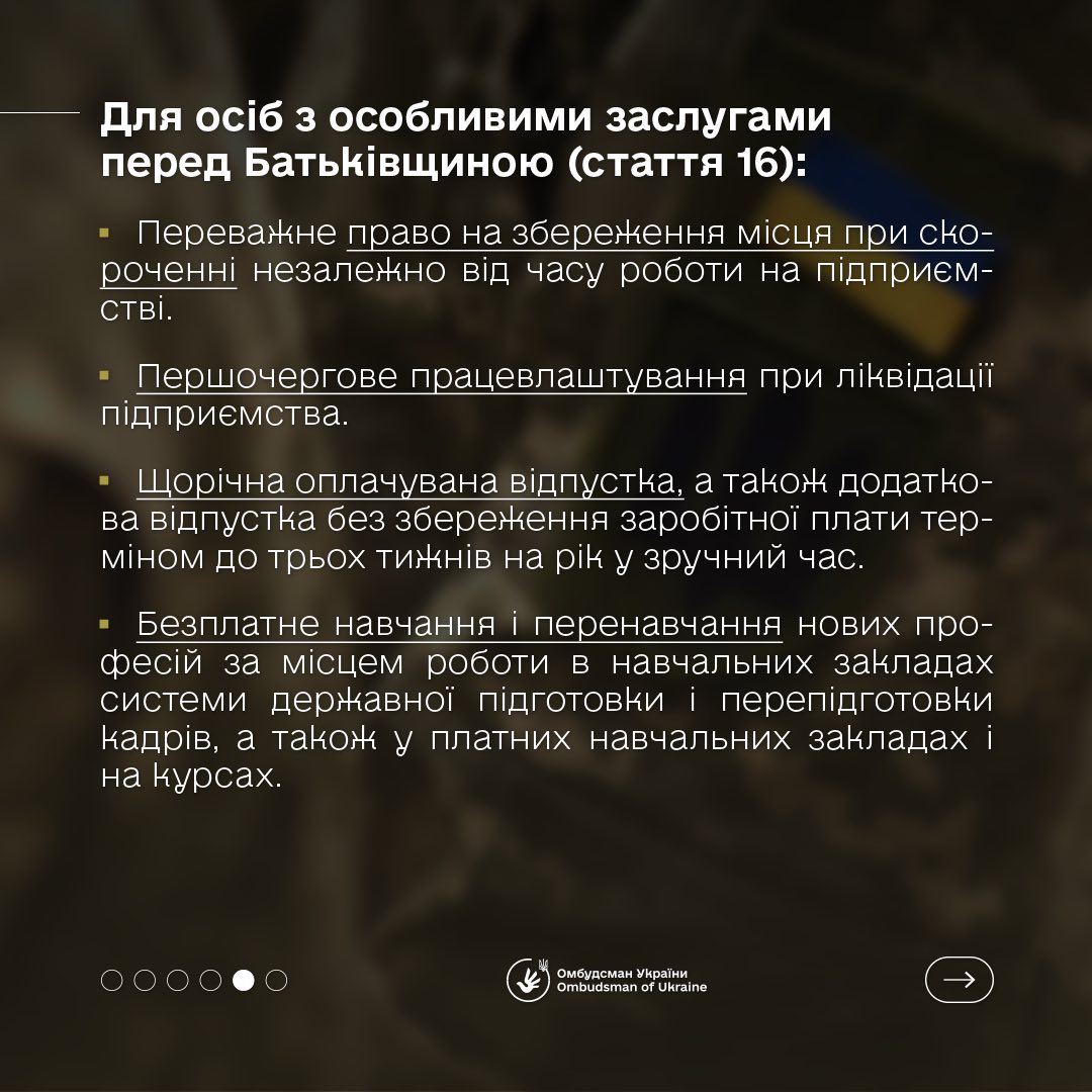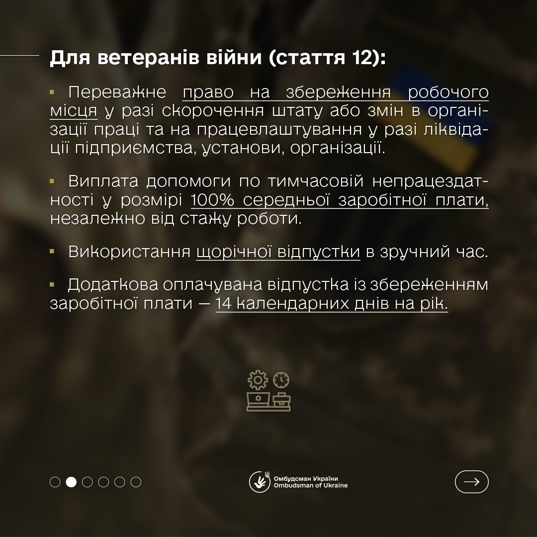 - Додаткова відпустка: Ветерани війни мають право на додаткову оплачувану відпустку тривалістю до 14 календарних днів на рік.