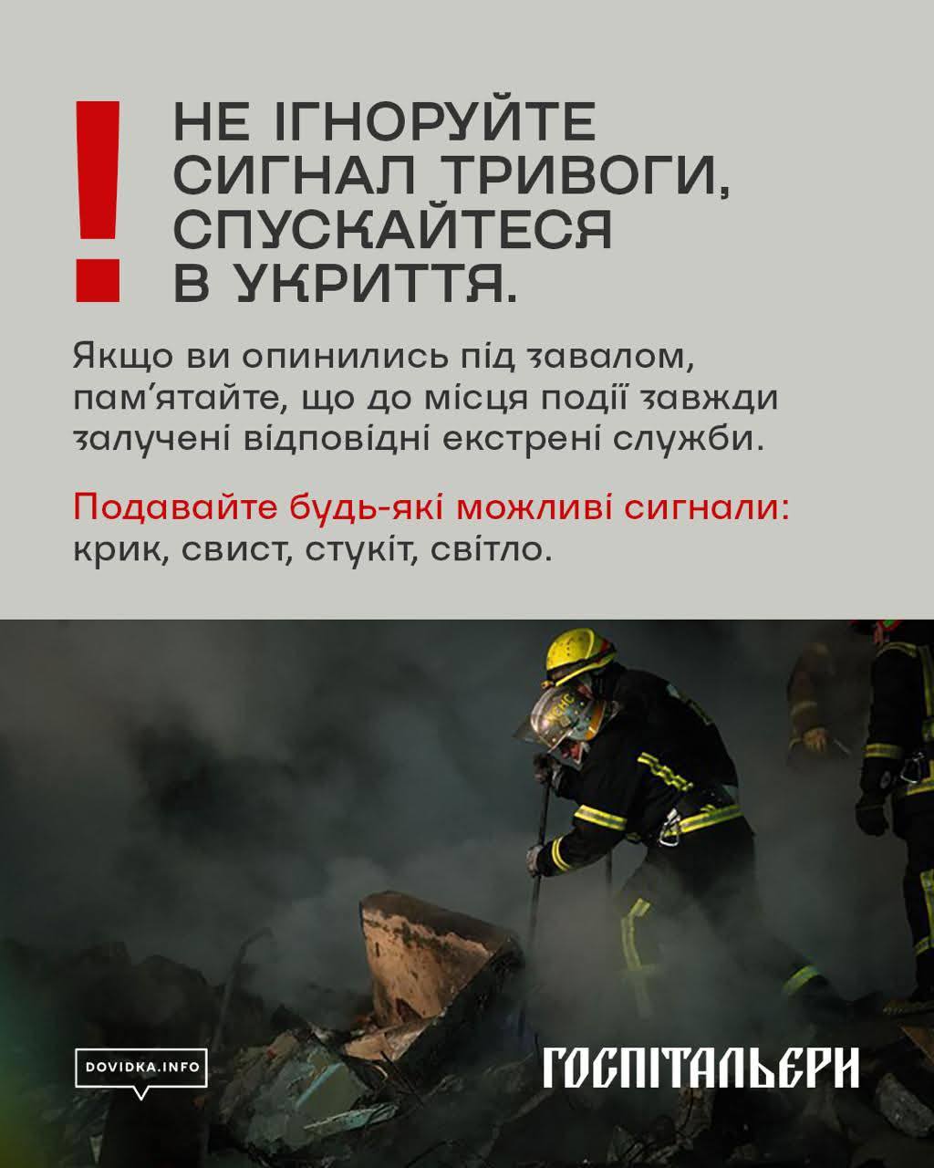 На жаль, ворожі обстріли українських міст та сіл стали частиною щоденної реальності. Агресор дедалі частіше цілить по житлових будинках, медичних закладах, укриттях та об’єктах критичної інфраструктури, наражаючи на небезпеку цілі родини. Саме тому вкрай важливо, щоб кожен громадянин знав базові правила поведінки у випадку, якщо ви або ваші рідні опинилися під завалами. Ці знання можуть врятувати життя.‼️Якщо ви опинилися під завалами, ваше головне завдання — максимально спростити процес пошуку для рятувальників. Використовуйте будь-які доступні способи для подачі сигналів: голосно кричіть, стукайте по металевих або бетонних конструкціях, свистіть, якщо маєте свисток, або використовуйте світло — ліхтарик чи екран телефону. Пам’ятайте, що під час так званих «хвилин тиші» вся рятувальна техніка припиняє роботу, щоб вловити найменші звуки з-під руїн. Саме в ці критичні моменти ваші сигнали, подані з-під завалів, можуть стати вирішальним шансом на порятунок. Якщо є можливість, не припиняйте подавати звуки в цей період. Категорично заборонено використовувати сірники чи запальнички, оскільки це може призвести до вибуху або пожежі через можливий витік газу. Також уникайте самостійних спроб розбирати уламки – це може спричинити подальший обвал усієї конструкції, поставивши під загрозу ваше життя та життя рятувальників. Якщо вам все ж вдалося вибратися самостійно, негайно огляньте себе на наявність травм та за можливості надайте собі або іншим постраждалим першу допомогу.‼️Дії при затисненні кінцівок є одним із найскладніших аспектів виживання під завалами. Часто людину притискає уламками конструкцій. Якщо кінцівку можна легко звільнити, робіть це максимально обережно. Проте, якщо кінцівку затиснуло серйозно, і для її звільнення необхідна допомога інших людей або спеціальних засобів, категорично не можна робити це самостійно без попереднього накладання турнікета. Це може призвести до пошкодження великих судин та масивної, небезпечної для життя кровотечі. Особливо небезпечною є ситуація, коли кінцівка перебуває під тиском понад дві години. Тривале стискання зупиняє кровообіг у тканинах, що призводить до накопичення токсинів. Різке зняття тиску в таких випадках може спричинити потрапляння цих токсинів у кров, що може спровокувати гостру ниркову недостатність, серцеві порушення та навіть смерть, відому як синдром тривалого стискання. У таких критичних випадках турнікет слід накладати вище місця стиснення (на 5–8 см, уникаючи суглобів). Обов’язково позначте час накладання — для цього використовуйте водостійкий маркер. Знімати турнікет має виключно кваліфікований медичний фахівець. Це життєво важливе правило першої допомоги.‼️Як зберегти тепло і уникнути переохолодження, перебуваючи під завалами, є ще одним критичним фактором. Навіть при плюсовій температурі ризик переохолодження залишається високим, особливо якщо людина отримала поранення або втратила значну кількість крові. Організм втрачає здатність самостійно підтримувати стабільну температуру, що може призвести до тяжких наслідків: порушення роботи серця, гіпоксії, порушень свідомості та порушення згортання крові. Щоб уникнути переохолодження та зберегти тепло, використовуйте все доступне: ковдри, термоковдри, одяг, рушники. Особливо важливо утеп