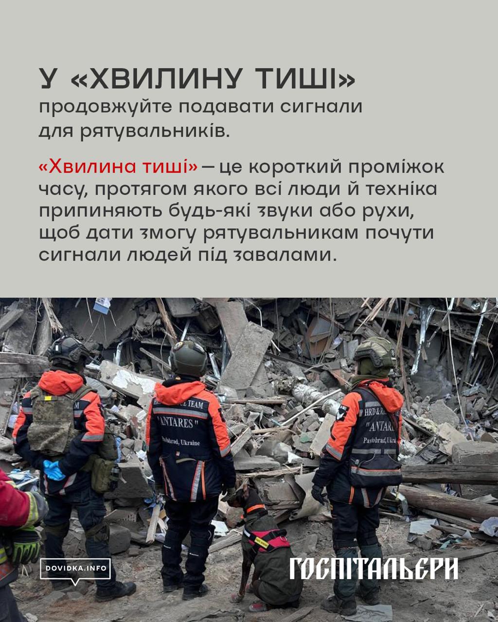 Під час спеціальних «хвилин тиші» вся рятувальна техніка припиняє роботу, аби вловити будь-які звуки з-під завалів. Саме в ці хвилини ваші сигнали можуть стати шансом на порятунок.