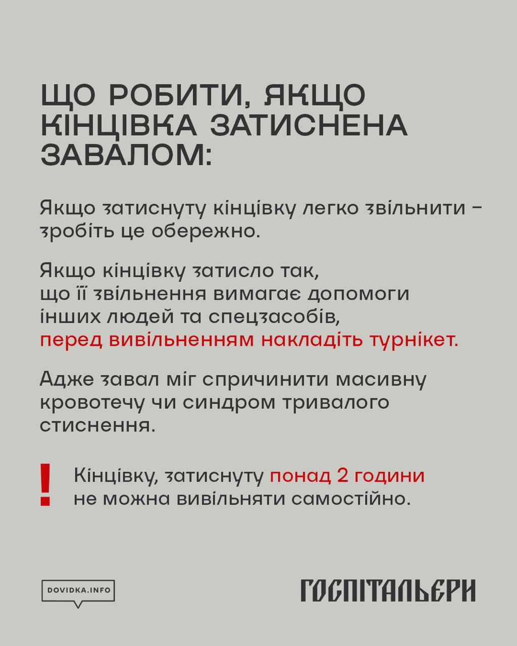 Якщо кінцівку можна легко вивільнити — робіть це дуже обережно. Однак якщо кінцівку затиснуло серйозно, і для звільнення потрібна допомога інших людей чи спецзасобів, категорично не можна робити це самостійно без попереднього накладання турнікета.