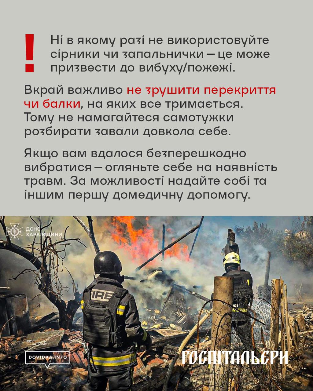 ❌У жодному разі не використовуйте сірники чи запальнички, адже це може призвести до вибуху або пожежі через можливі витоки газу. Уникайте будь-яких спроб самостійно розбирати уламки — це може спричинити обвал всієї конструкції.