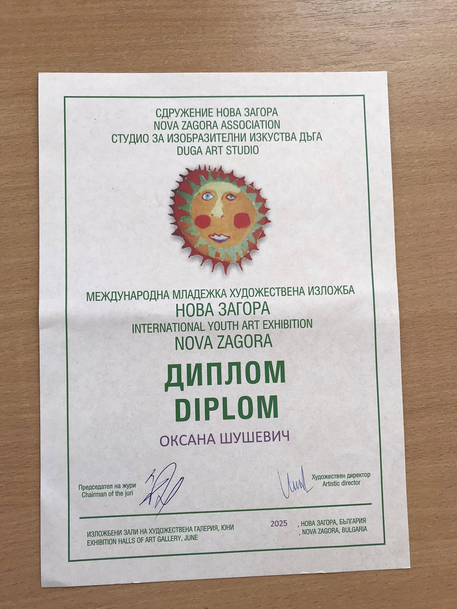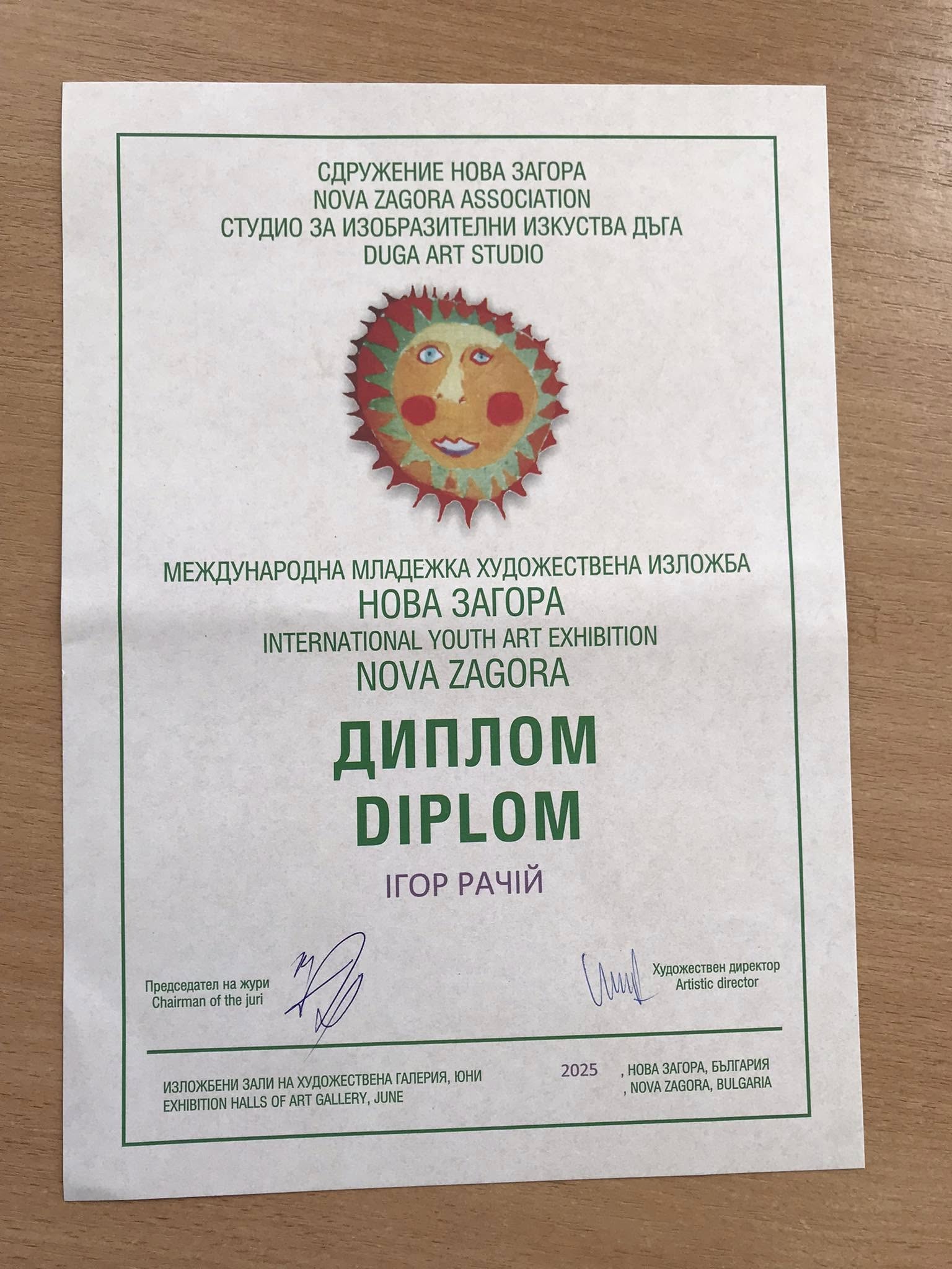 Радісні новини приходять із Болгарії, де успішно завершився престижний Міжнародний дитячий художній конкурс. Цей масштабний захід, що зібрав талановитих юних художників із 35 країн світу, став ареною для демонстрації справжнього обдарування. Особливу гордість відчуває Україна, адже серед дипломантів конкурсу є й представники Підгаєцької Художньої школи народних ремесел Підгаєцької міської ради.Мова йде про юних майстрів, Оксану Шушевич та Ігоря Рачія, чиї роботи були високо оцінені міжнародним журі. Їхні творчі досягнення є яскравим свідченням наполегливої праці, таланту та професіоналізму викладацького складу. Велика подяка належить їхньому викладачеві, Ользі Карій, яка доклала значних зусиль для розкриття потенціалу своїх учнів та підготовки їх до такого серйозного випробування на Міжнародному дитячому художньому конкурсі. Завдяки її відданій праці та вірі у здібності Оксани та Ігоря, Підгайці можуть пишатися своїми талановитими представниками на світовій арені мистецтва.