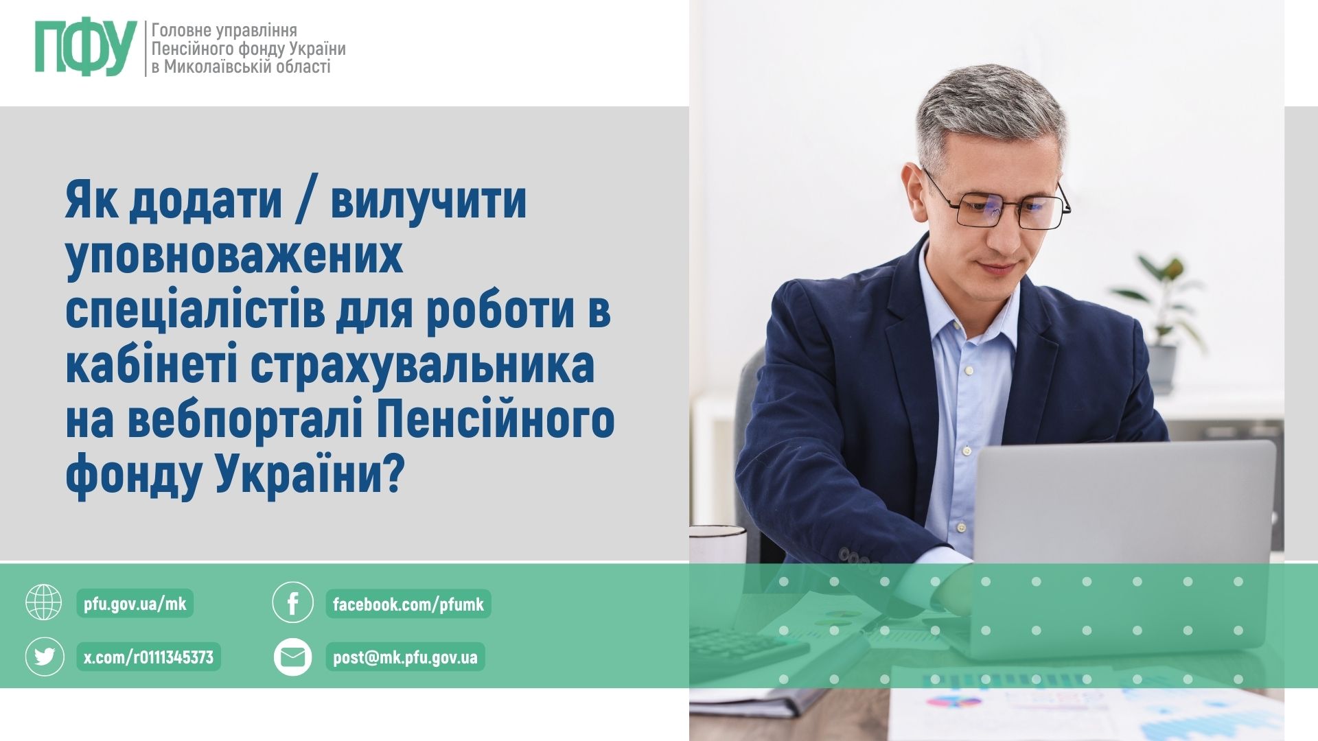 В особистому кабінеті страхувальника на вебпорталі електронних послуг Пенсійного фонду України передбачена можливість надання доступу уповноваженим спеціалістам. Ці спеціалісти, як правило, мають службовий кваліфікований електронний підпис, що забезпечує безпеку та ідентифікацію особи.