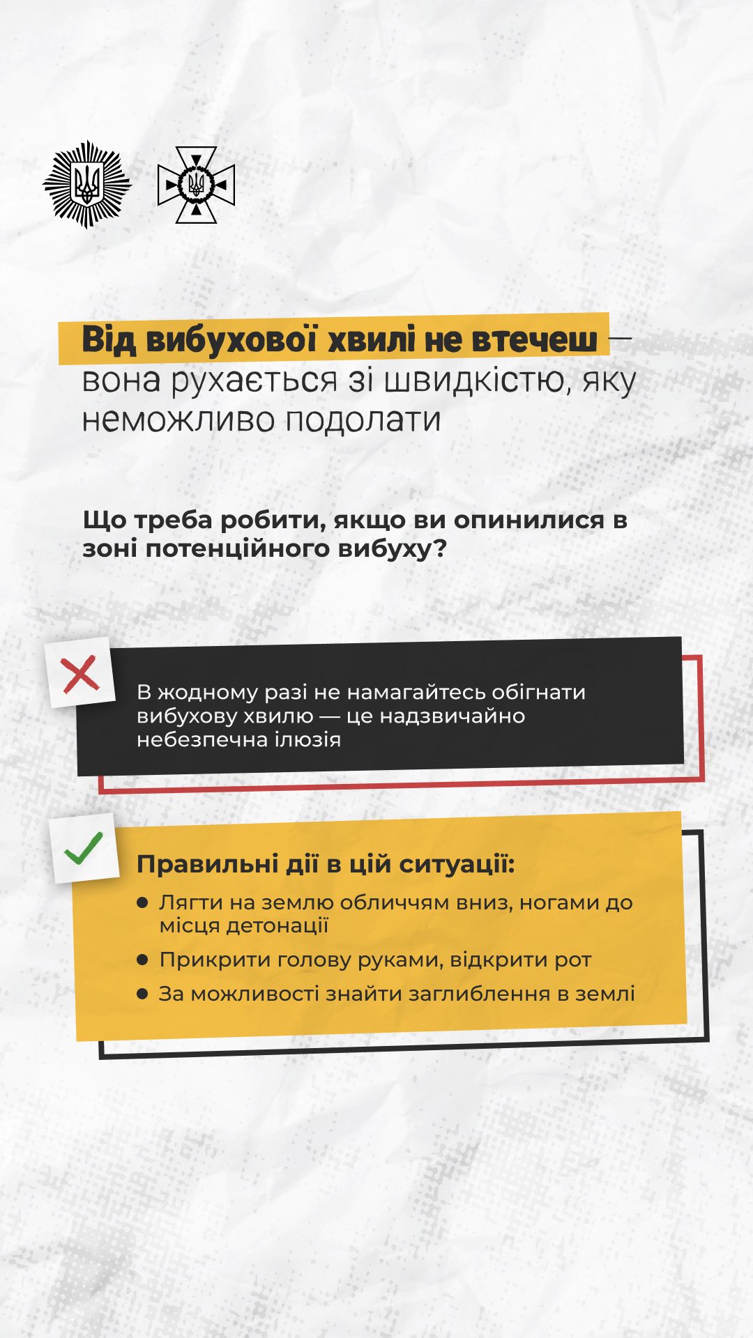 ❌Не намагайтеся втекти від вибухової хвилі. Вона поширюється зі швидкістю, яка значно перевищує швидкість людини або транспортного засобу. Вибухи мають непередбачуваний характер, безпечний напрямок руху визначити практично неможливо.